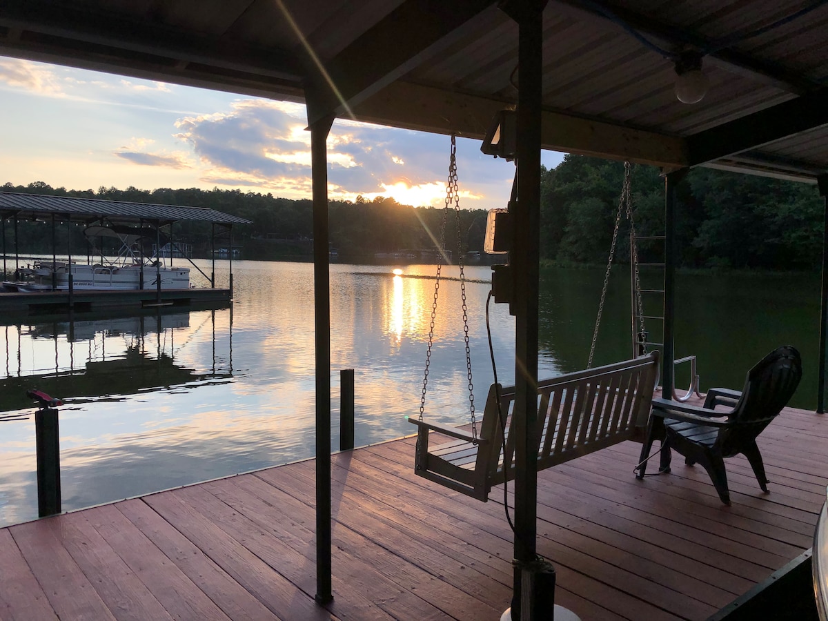 Featured in AJC as one of Georgia's top Airbnb's! We designed our lakefront A-frame cabin to provide the perfect getaway, and we love sharing our home with you. Wake up to sunrises over the lake while you sip coffee on the large deck or drink hot cocoa by the fire pit. Our modern kitchen also begs to be cooked in. In warmer months, enjoy swimming, kayaking, or paddle boarding off the private dock. Whether you want to relax or work on spreadsheets, you'll enjoy a beautiful view while doing so.