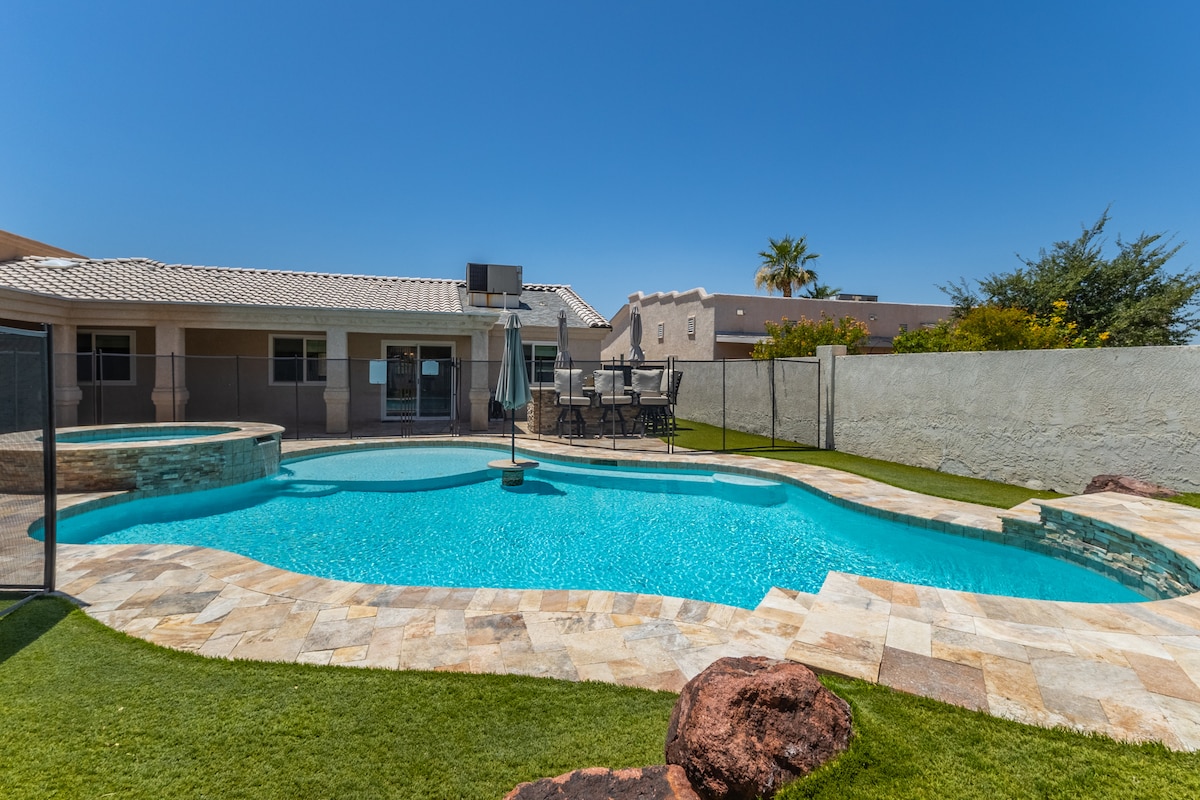 Recently renovated 2120 sqft home 9 minutes from The London Bridge, shops, restaurants, beach, and boat launch. Quiet neighborhood -no neighbors behind you. Ceiling fans throughout. AC can be turned on prior to arrival. Sleeps 9 on beds. Enjoy a relaxing swim or volleyball (provided) in an athletic pool and stargazing in an 8’ spa (extra charge for propane to heat). Bathrooms include shampoo/conditioner/ body wash. We’re certain you’ll relax & enjoy your stay!