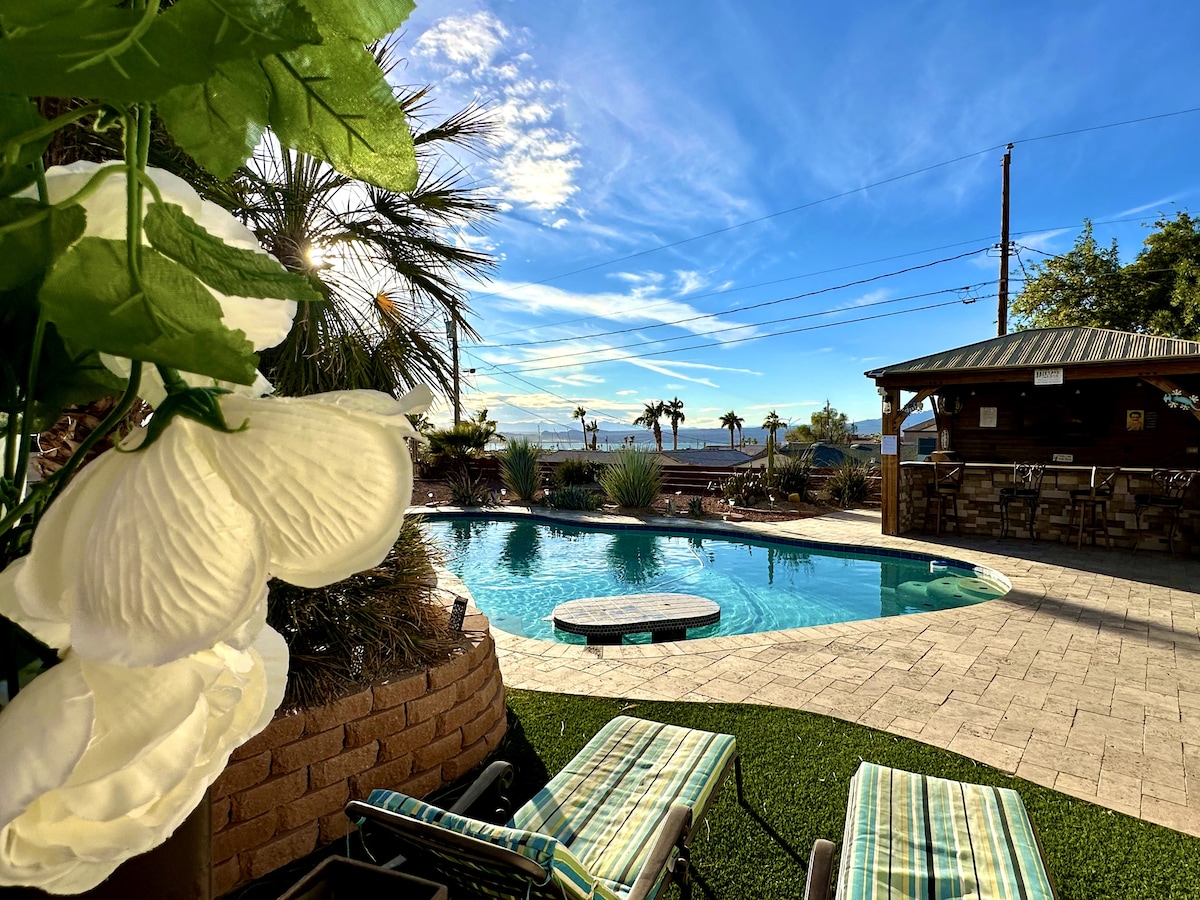 Living the dream at Desert Paradise. This fully renovated house is an oasis with a resort feeling. The laguna pool with waterfall, hot tub, outdoor bar and entertainment center, breathtaking lake views, and romantic sunsets make this vacation home a true paradise. The 3 bed/2bath house is nicely decorated and offers all you need for a home away from home. The city center is only 2 miles away with restaurants, boating, and the famous London Bridge. Take a break and unwind at this peaceful oasis.
