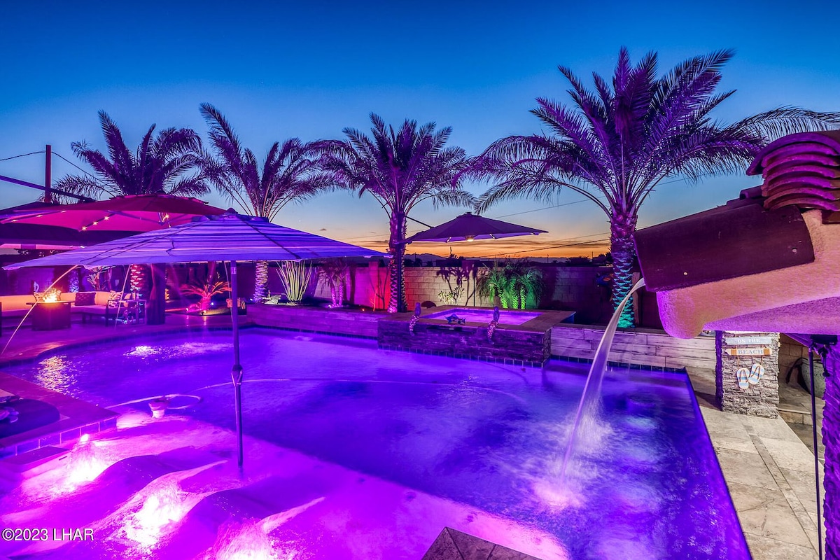 Havasu's #1 rated modern home. 2021 build 3 bed 3 bath lake view home /w pool & spa. NEWLY ADDED: living room plug-in play video game system wall HDMI port Perfect getaway! High end furnishing & technology. Yard has palms for privacy & outdoor kitchen patio cover. 5 min from Bridge & Main St 2 min from lake. Control4 home automation, KitchenAide/Wolf Appliances, Hunter Douglas motor blinds, 2 fireplaces, home theatre, outdoor kitchen, Phillips Hue lighting. Sonos sound & Restoration Hardware