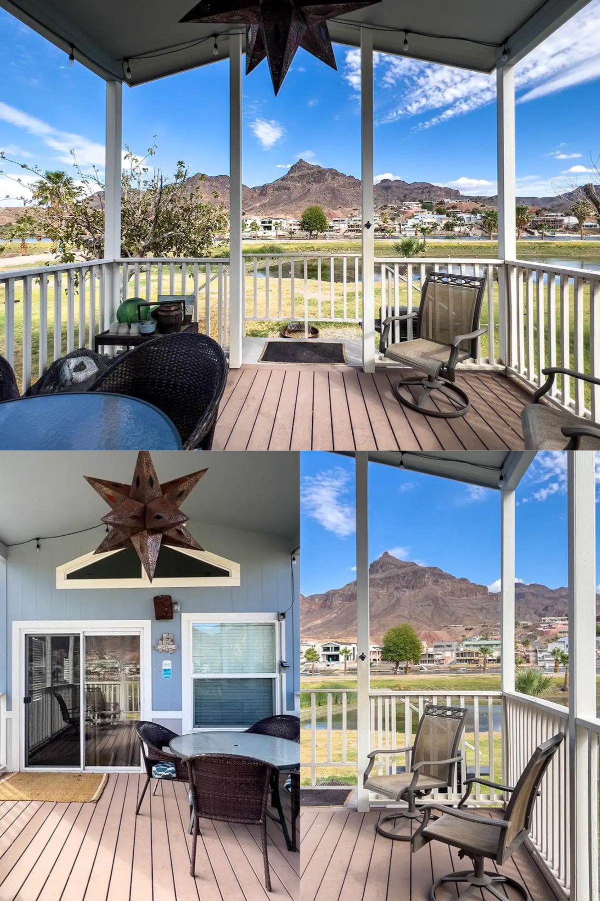 Come relax and enjoy this Boho style two-bedroom, one bath private park model home in a resort style setting. Sit on the large wrap around covered deck to enjoy your morning coffee or evening drinks while admiring the partial lake view, red mountains, and beautiful desert sunsets! *We do require guests that would like to book with us to be at the minimum age of 25 years old and older only* We also ask that guests provide a photo id on the Airbnb platform when you book with us for proof of age
