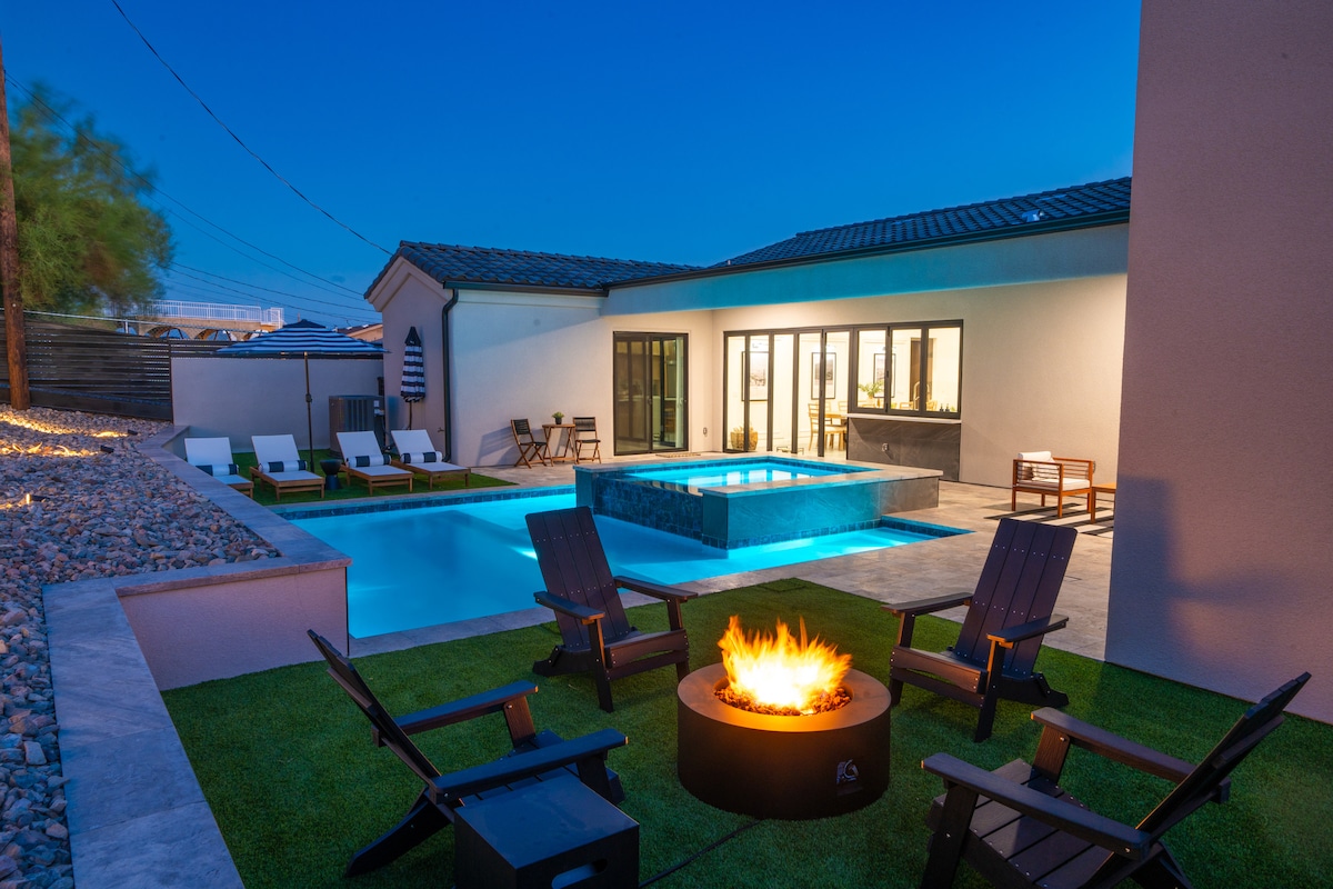 ⭐️ 3000 sq ft w/ luxury design and decor ⭐️ Mins to Riviera Marina and Downtown ⭐️ King Size Beds ⭐️ Hammock, games & putting green ⭐️ Golf Course and Mountain View’s ⭐️ Located on second green Our fully renovated Indoor-outdoor vacation home is a true experience in Lake Havasu City Nearly 3000 square feet and room for 14 guests, The Clubhouse looks like a 5-star resort, and feels like a home crafted with love. Amenities include a pool, hot tub, hammock, putting green & fire pit.