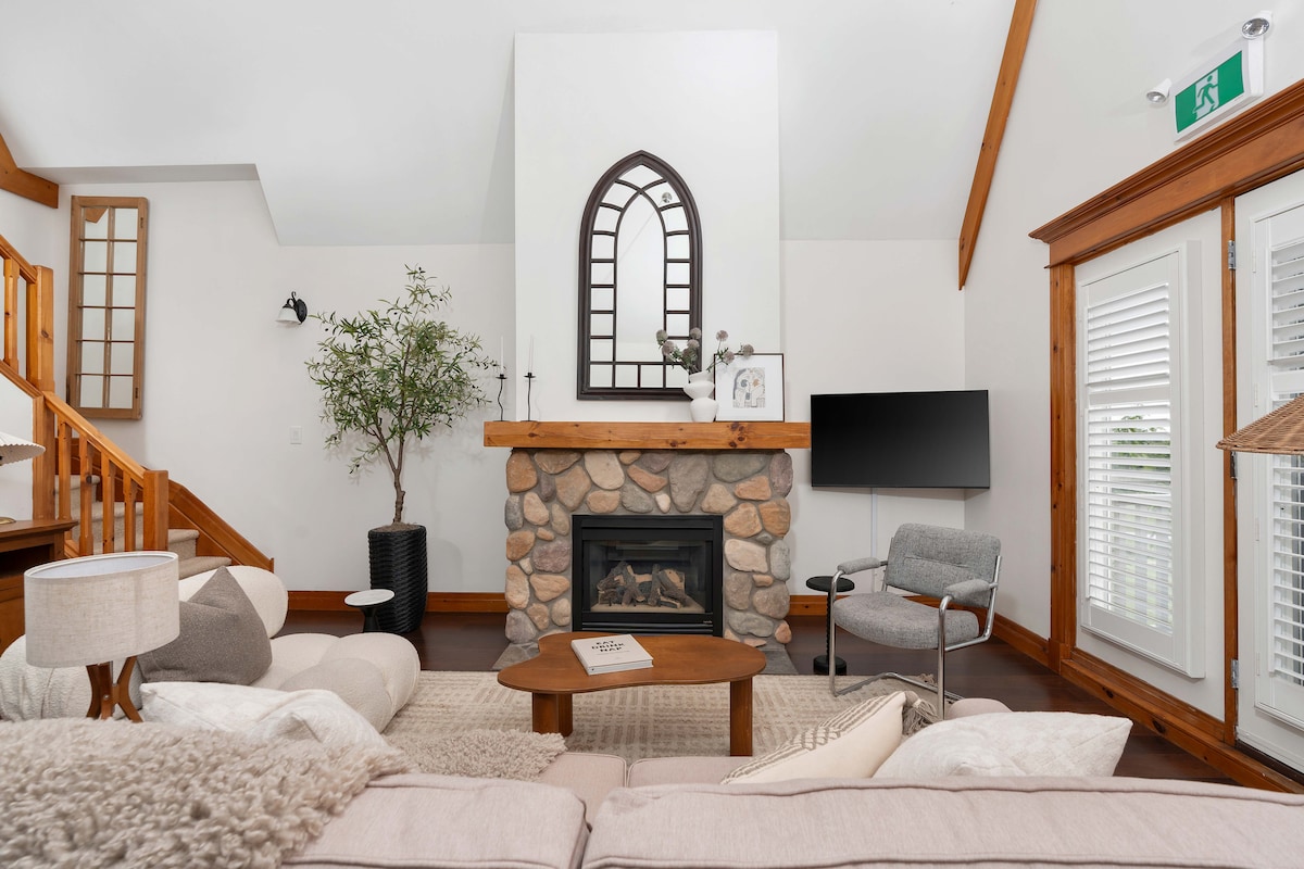 Haven in the Wood is a mid-century A-frame nestled in a lake community right across the street from a private all-sports lake. This recently renovated cabin features an open concept floor plan and boasts a modern-rustic aesthetic. The cabin resides in the heart of northern Michigan with proximity to many golf and ski resorts, nature and snowmobile trails, lakes and state parks. Listen to records, have a bonfire, relax in the hot tub, or take a walk along the beautiful Lake Louise!