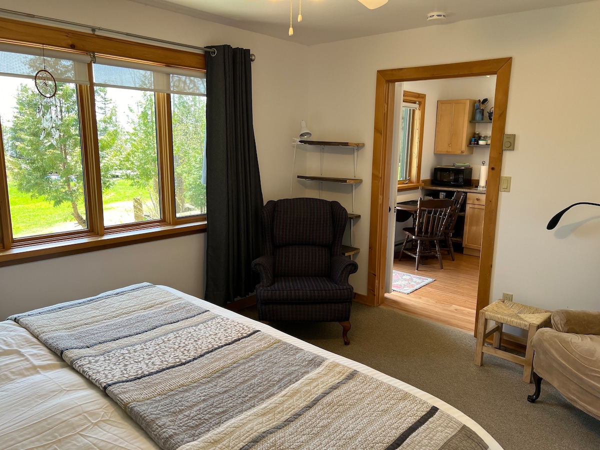 Bright, ground floor suite with King size bed at Green Bay Lodge, a boutique resort on Lake Manitou. Waterfront with lake view. Centrally located, the perfect retreat to sight see our magical island. Peaceful and serene, Green Bay Lodge is nature at it's best. Perfect for outdoor adventures! Fish, swim, canoe, hike, snowmobile, ice fish, snow shoe, cross country ski and star gaze to your hearts content. Relax and enjoy a drink by the outdoor campfire.