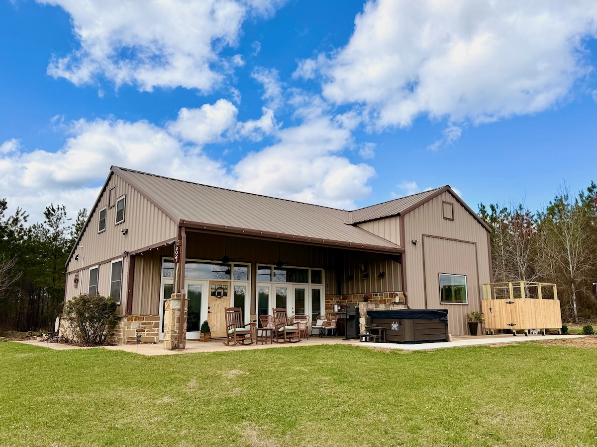 "Unplug at our private lake cabin, perfect for couples, quiet workcations, & weekend escapes. Cozy fire pit, & peaceful water views just steps away. "Voted No. 1 Airbnb in Tyler Area 2018". Custom built on our East Texas Farm peeking out over beautiful Lake Palestine. Combines unique assortment of refurbished wood to give a cozy feel. Full kitchen & bathroom, sleeper sofa. Our Classic Movie theme, Little Reata got it's name from the Epic film "Giant." Shared access to Hot Tub & Fishing pier.