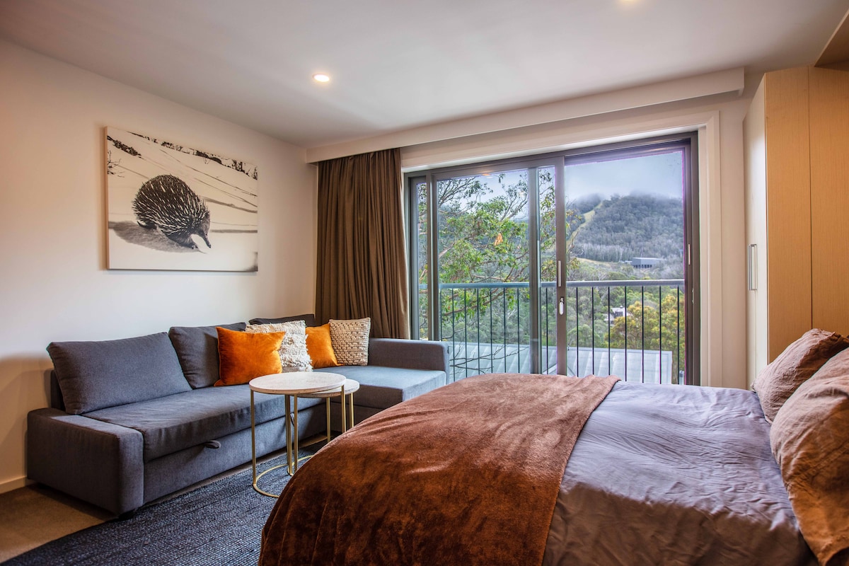 Our open plan Apartment in Jindabyne is a wonderful place for your family and friends to relax and enjoy the views of Lake Jindabyne. You’re surrounded by natural bushland while only being a 1 minutes drive to the town center! Resorts are only 30mins away. A beautifully renovated 1 bedroom apt. With new furnishings throughout and heating to keep you toasty warm. This apartment boasts a main bedroom with beautifully appointed queen bed and wardrobe, and a pull out sofabed in the lounge room.