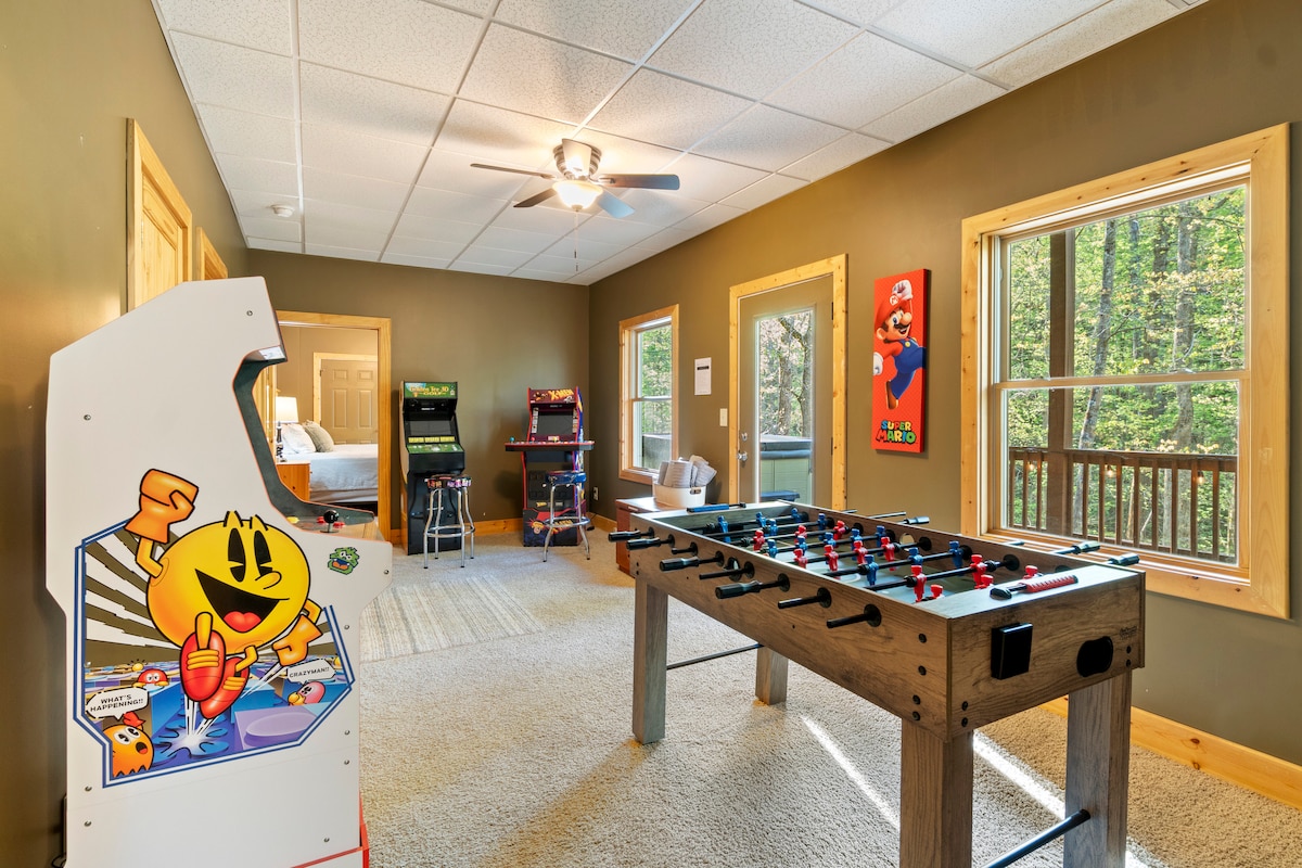 Escape to this charming cabin, the perfect summer retreat for family adventures! Xbox added! Start your mornings with coffee on the porch as kids play on the playset, or watch for deer. Spend afternoons playing mini golf, soaking in the hot tub, or enjoying an outdoor movie under the stars. Challenge your family to shuffleboard, darts, or arcade games, or gather around the fire pit for s’mores. Whether exploring Ellijay’s trails and rivers or unwinding at the cabin, it’s the ultimate getaway!