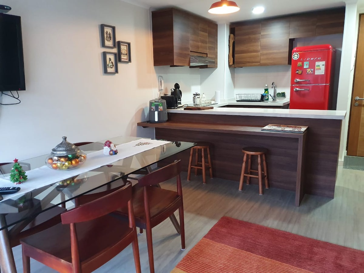 New apartment, with 4 or 5 person capacity. Master bedroom with 2 person bed, living has a sofa bed for 2 more people and also there’s a folding bed for a 5th person. The apartment is full electric. It is located one block from downtown Puerto Varas, 5 from the casino, 6 from the lake and next to a supermarket. Also, the building has access to laundry, gym and barbecue sector. There is no parking.