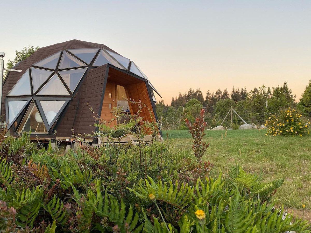 Conecta con la naturaleza en esta escapada inolvidable. Vive la experiencia de alojar en un domo y disfrutar la vista del cielo estrellado. Siente la lluvia y el viento desde su interior de manera intensa, debido a nuestro clima lluvioso. Conoce el maravilloso entorno de nuestra ciudad Frutillar, contamos con volcanes - lagos - gastronomía - arte y mucha naturaleza a tu disposición. Te esperamos en nuestra marcha blanca, aun seguimos trabajando duro en este proyecto. Familia Ibaceta-Benn