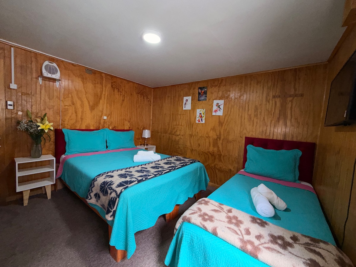 Habitacion familiar triple en hostal ubicado en llanquihue, en un tranquilo barrio residencial, a unos 50 metros del lago llanquihue y su costanera. A 12 min caminando de la estación de trenes