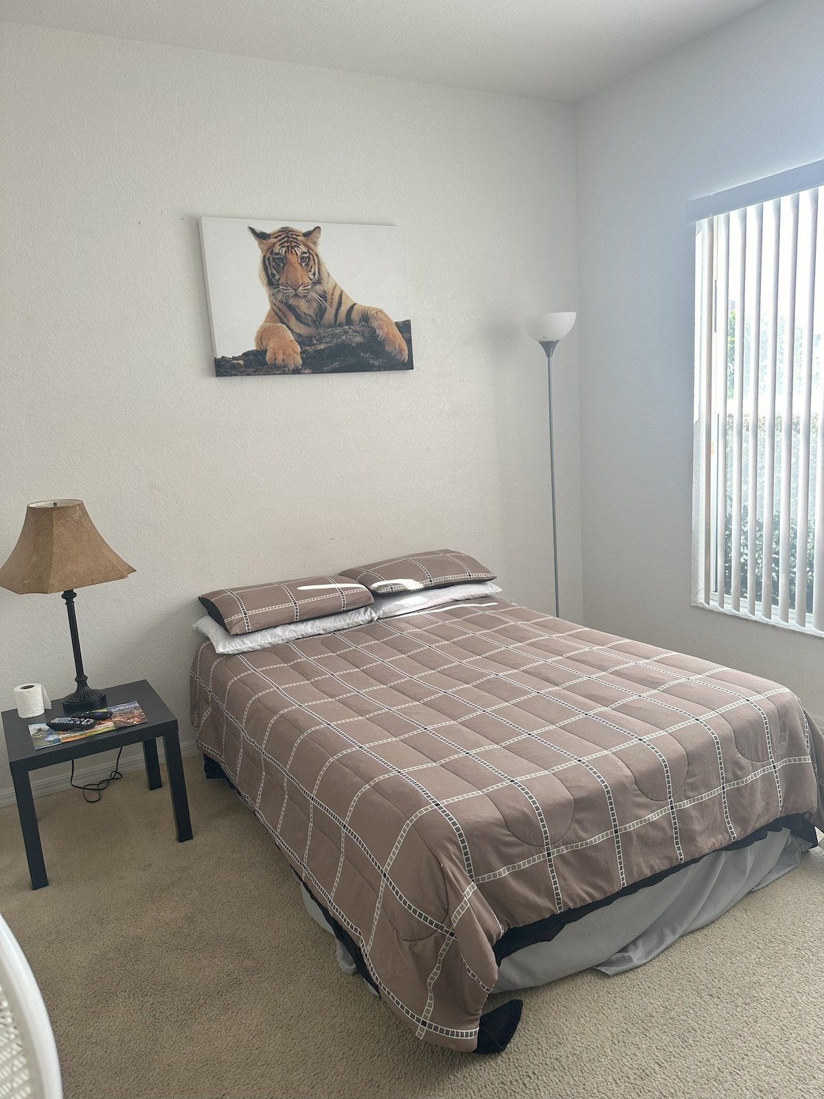 Quiet Private Large Studio in Davenport with its own entryway & parking for 1 car. Room has AC, Ceiling Fan, small fridge, microwave, & a queen size bed. Small dining or workspace area with seats for 2. Includes internet & a TV for streaming services. Has a private bathroom. Has no kitchen. Great location off of US 27 & I-4. Plenty of shopping, food, medical, & more facilities nearby. 12 miles from Disney and 25 miles to Universal Studio.
