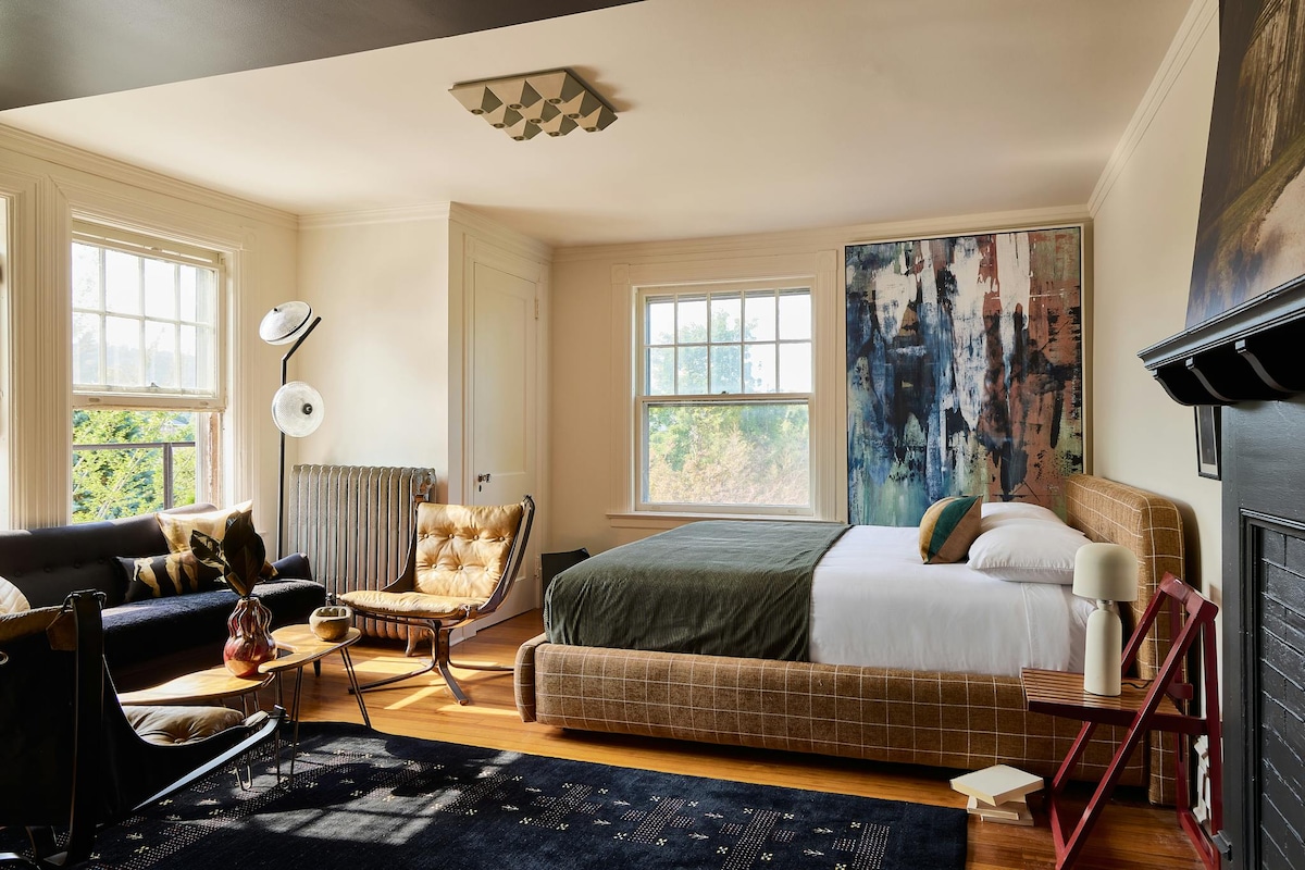 1936 Georgian-Revival, turned Coffee + Cocktail Bar, Housing NC's Smallest Boutique Hotel. This moody, color-drenched studio offers a private balcony with mountain views. Please note: the coffee/bar is open to the public and there is potential for noise. The bar closes at 9pm on weekdays and 10pm on Fri/Sat. Hotel is suggested adults only (21+)