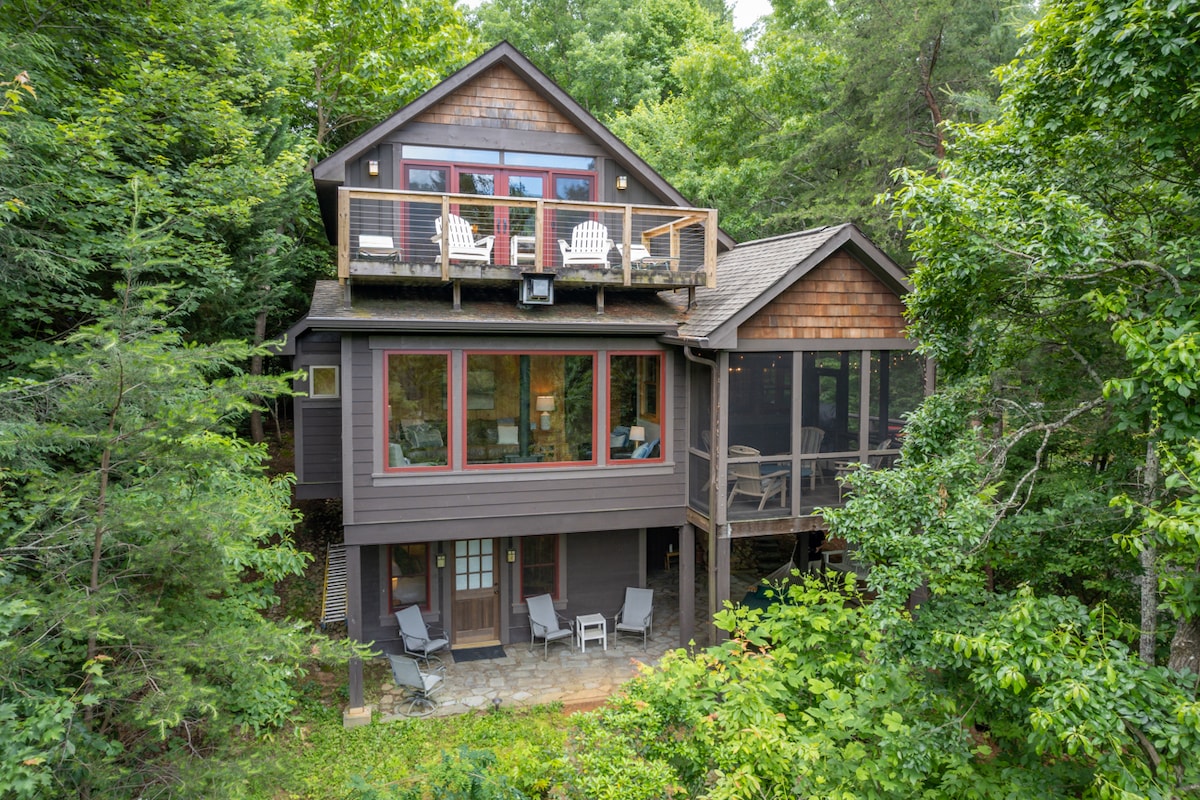 Unwind in a secluded mountain hideaway, where towering trees, rhododendron slopes, and the soothing sounds of a stream welcome you. Natural light pours through skylights and large windows, creating a warm, inviting space w/ artisan touches throughout. 🌿 2 Private Acres | 🔥 Fire Pit | ✨ Stargazing Decks | 🛁 Hot Tub | 🐶 Dog-friendly Perfect for a peaceful getaway, adventure seekers, or remote work. Surrounded by forest, a stream, and the sounds of nature, your private mountain sanctuary.