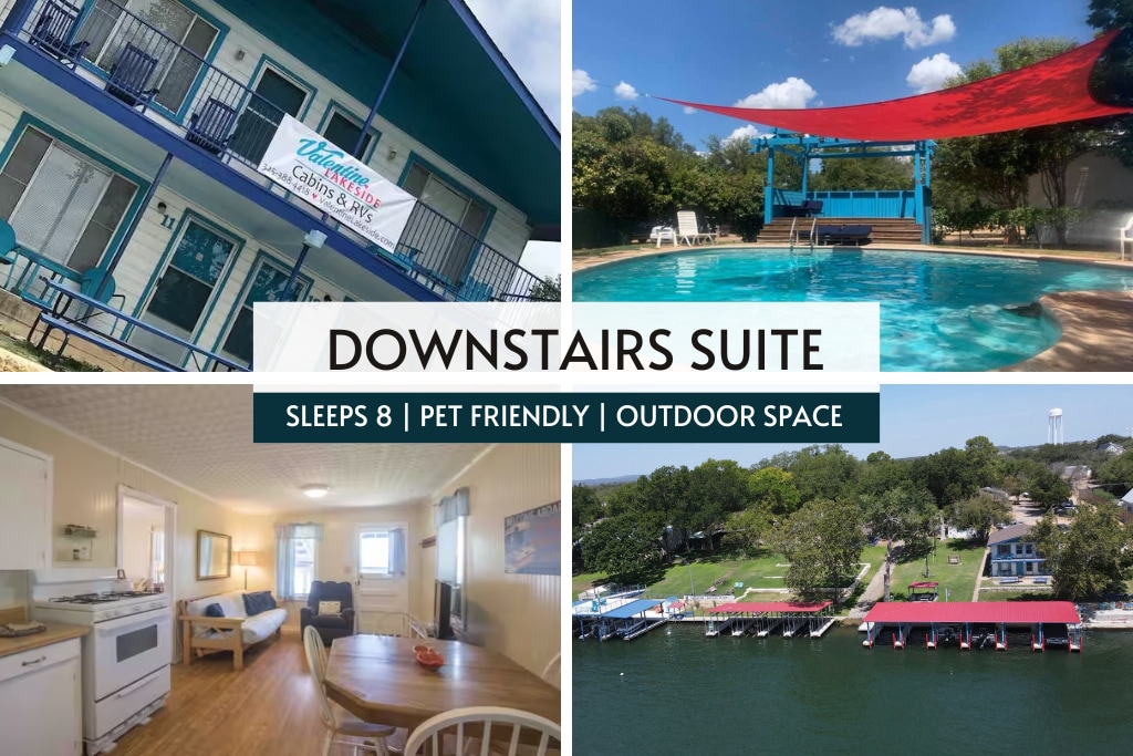 Welcome to Lakefront Suite 12 at Valentine Lakeside, part of the charming Lakefront Suites Collection — a two-story quadplex overlooking beautiful Lake LBJ. The Upper-Level Suites are conveniently located at ground level with easy access from the parking area, while the Lower-Level Suites, like Suite 12, sit just below, accessible by a short walkway that gently slopes toward the water’s edge.