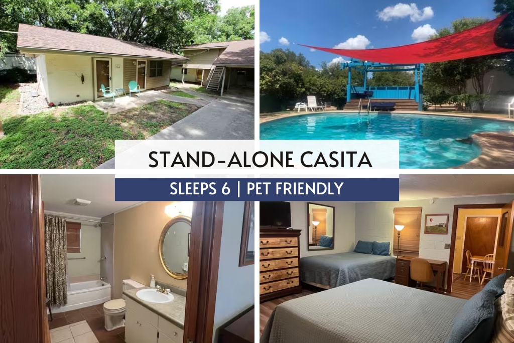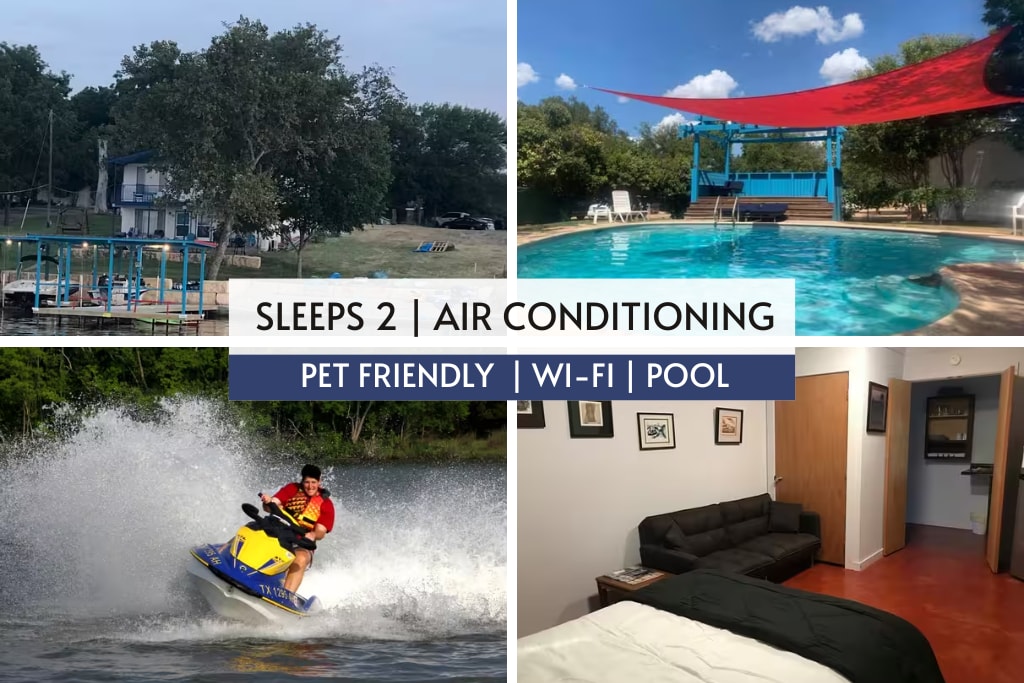 Welcome to The Casita at Valentine Lakeside, a charming stand-alone retreat designed for relaxation, comfort, and lake access! This spacious one-bedroom getaway offers a true home-away-from-home experience — complete with a full kitchen, comfortable sleeping spaces for families or groups, and a peek-a-boo view of Lake LBJ from both the bedroom and living room.