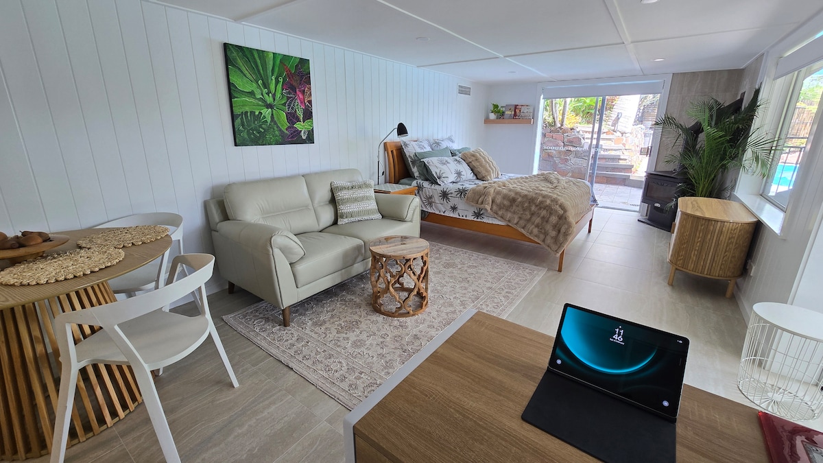This roomy and private self-contained studio apartment is situated on the lower ground floor of our home. The studio extends to your own outdoor BBQ dining and lounge area with chlorine free hot tub and large games room. Of course you are also welcome to use our freshwater pool outside the winter season. With nearby beaches and bushland you can enjoy many great outdoor activities. We hope you choose this comfortable, modern, resort life style for your next holiday or weekend away.