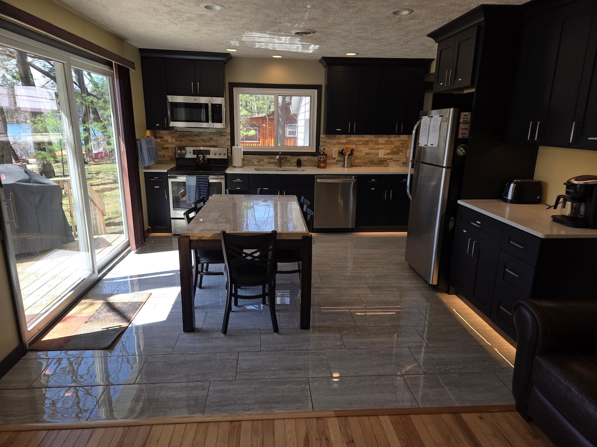 Welcome to your peaceful escape! Delight in the charm of our cottagecore retreat, offering breathtaking lake views. Relax on the spacious screened porch, enjoying the outdoors without pesky bugs. The cozy bedroom, dining area, and living room all feature stunning lake vistas. Pamper yourself in the bathroom with a luxurious soaking tub and steam shower. The kitchen, fitted with new appliances, makes cooking a breeze. From the living room, step onto the deck and soak in the serene environment.