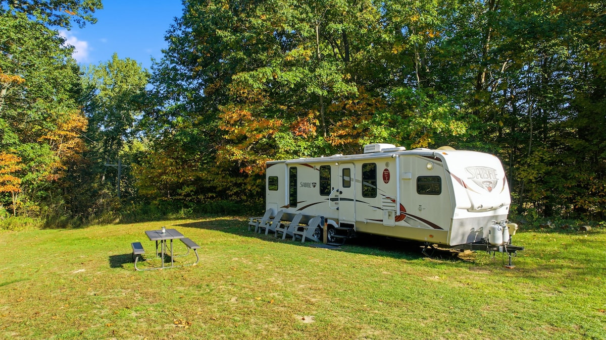 The Platte Camper - This 37ft 5th wheel camper is located on part of our 20 acres of woods. This RV has water, electricity, Heat/AC, a refrigerator, stove top and cooking stove, toilet, shower and other basic necessities. The camper is locates down our rail about 300 ft from the main house and 100-200ft from other campers on the property. There is a shared outdoor hot tub that is available for use. We do have a fire pit just outside the camper. There is a nice trail through the woods.