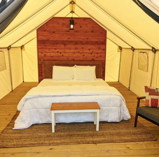 *New tents for 2024, photos soon* Reconnect with nature at this unforgettable escape. Our spacious glamping tents offer a slower paced, country atmosphere with the comforts of an 8ft covered patio, king size bed, multi-purpose charging station, wood burning stove and igloo cooler (ice included!). Each tent has its own grill and fire ring, and on the greater campground you can enjoy horseshoes, beach volleyball, our custom built playground and much more! *Bath/Showers in separate building*