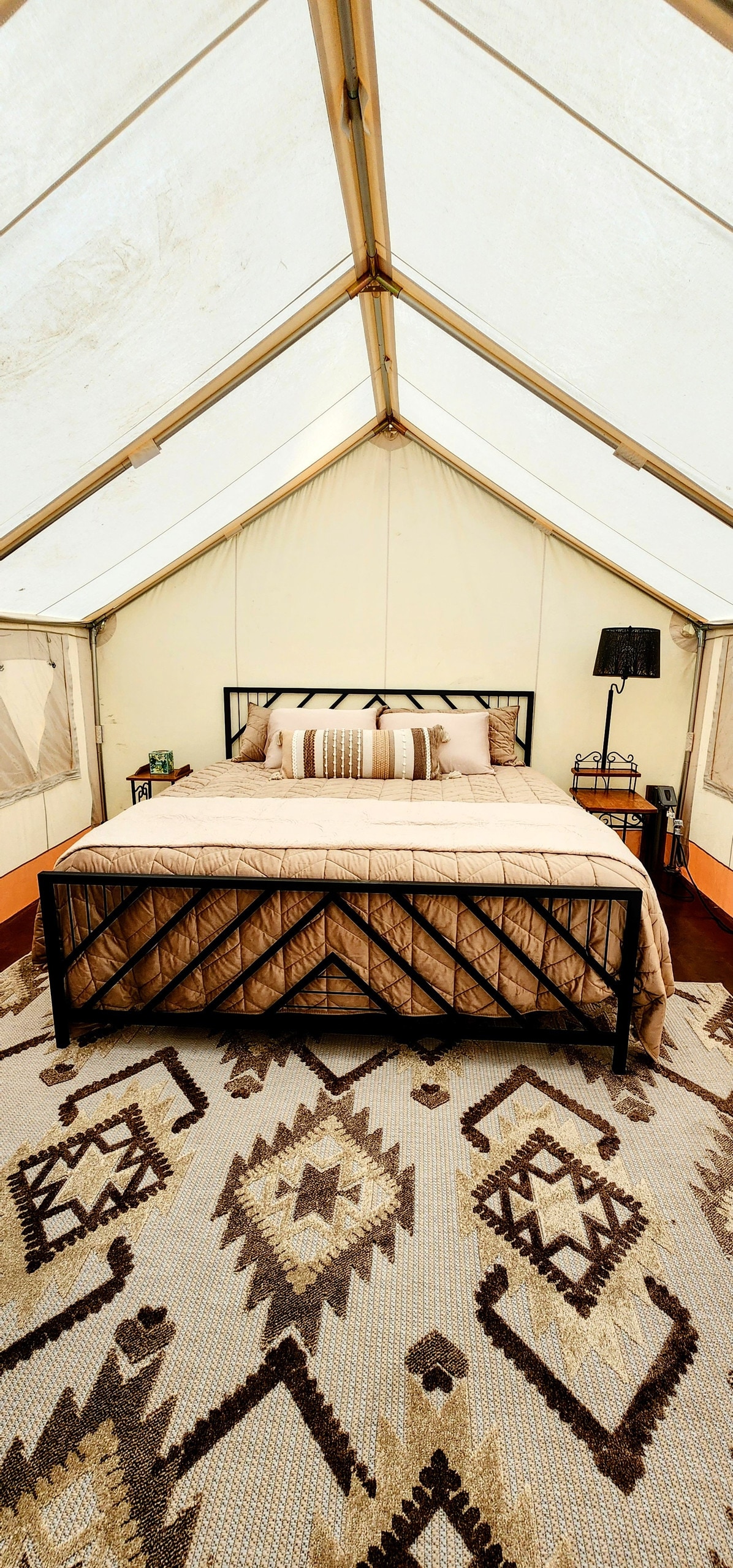 Our glamping tents redefine outdoor accommodation. You'll be nestled within a serene, natural setting. Indulge in a truly restful night's sleep on our king-size bed, with a plush mattress and luxurious linens. Michigan night's are getting chilly, but our thick blankets make Fall cozy. The tent's spacious 12 x 14 ft interior is tastefully decorated with thoughtful touches that create a truly inviting ambiance. You're bringing a large group? Check out our other listings on this property!