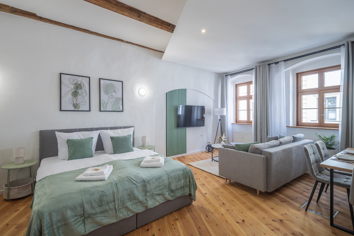 Hello and welcome to your new holiday home in the heart of Dresden. You can expect a very stylish, high-quality modernized 3.5 room apartment with 2 bedrooms, an additional double bed in the living room with a view of the historically grown garden. Enjoy the evening sun on the terrace with a dinner or with a glass of wine and a log fire in the whirlpool. You will find everything you need for an unforgettable time in Dresden on site.
