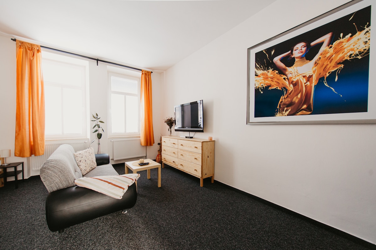 The apartment on the top floor is truly unique. It is located on the second floor and and the entire place has been restored to original building. The original roof wooden frame, exposed brickwork, original flooring, fully functional wooden stove helps you to imagine what people lived like at the beginning of last century. The main living area is facing the front of the house and therefor you will find a view on the town square, town house and the famous basalt rock “Jehla”.
