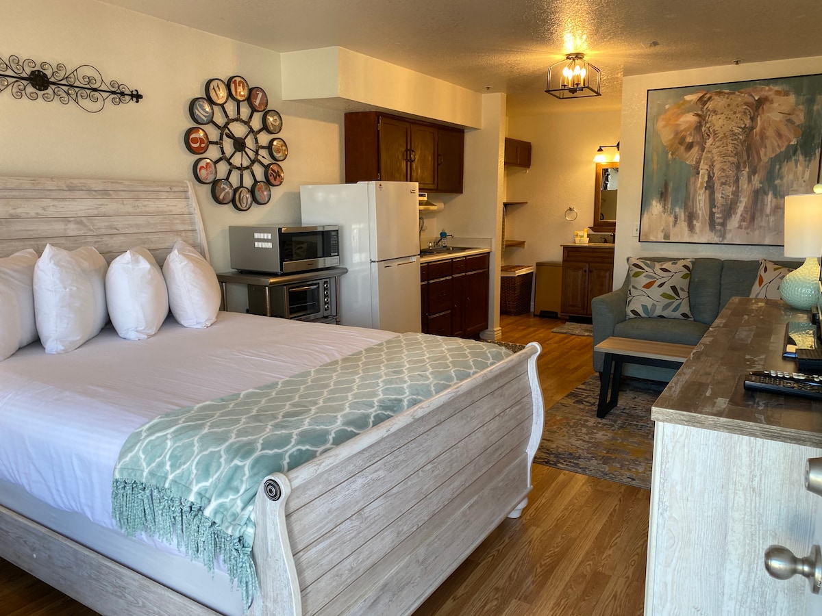 Stunning views of Mountains, River, and Laughlin casinos. King bed! Spacious bathroom, large shower. Kitchenette has full fridge, cooking appliances. Ample parking for toys. Patio fire pit for guests. Convenient parking outside room. Apartment is separated from the main house by a courtyard. * No pets/animals. Notice must be given bringing a service dog and disclose the task trained to perform. There are two dogs on the property. Snowbird reservations will be accepted beginning October.
