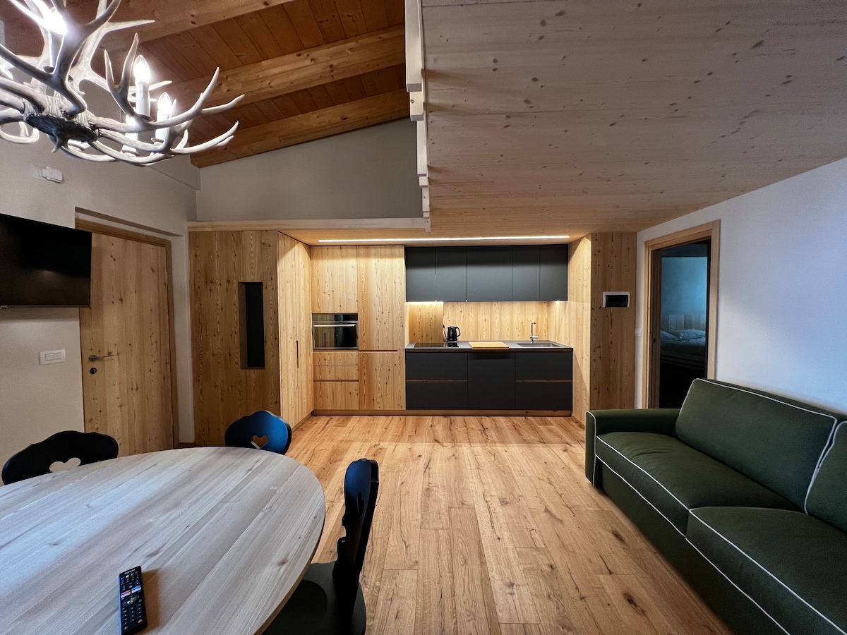 The apartment is a luxurious wooden penthouse with open space surrounded by balconies and terraces. Consisting of A double room with balcony, a bedroom with 2 single beds and a large terrace, bathroom with shower. Living room and open kitchen, with a large terrace and two panoramic balconies overlooking the Brenta Dolomites. The kitchen is equipped with oven, gas, microwave, American fridge, all necessary kitchen utensils.