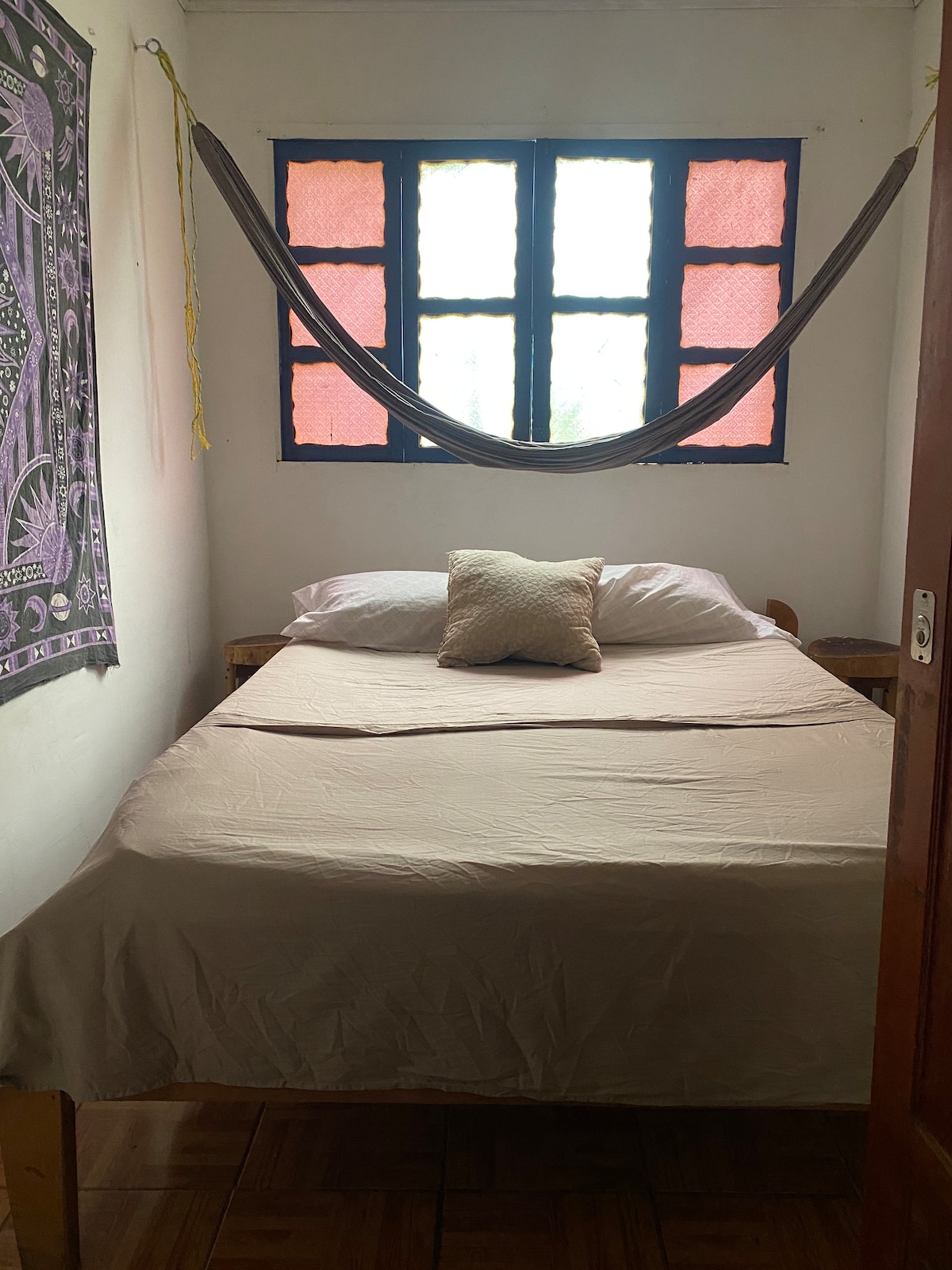 This apartment is 40m2, includes a kitchen area, bathroom with shower, a bedroom with ample storage and a 6m2 room which can be used as a work space. Additionally a 10m2 covered terrace with bar and hammock inside a lush garden. The apartment is located under another wooden cabin, is close to the street in the middle of the Camilo Ortega neighborhood. So you're part of Nicaraguan streetlife. Centrally located: small grocery stores at 20-50m, the beach at 150m and the center at 350m.