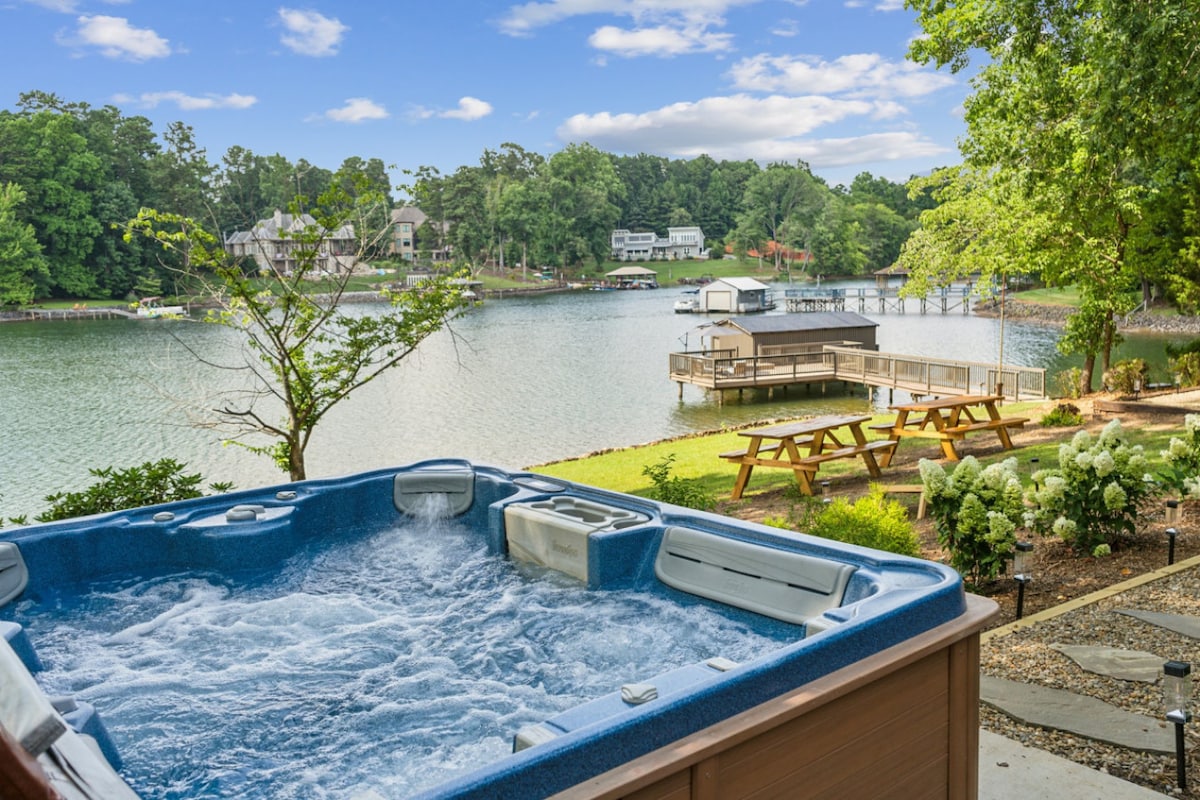 Lakefront modern chic home in a quiet Cove on Lake Norman with a gorgeous view. Enjoy this Retreat in luxury with friends and family at our well-appointed ranch style home that sits on over 120 feet of shoreline right on the water tucked away in a breathtaking private cove. Designed to accommodate up to 10 people in style. You choose, is it the hot tub, outdoor dining set that seats 10 on the deck overlooking the lake, the kayaks, the paddle boards or the fire pit for s'mores on the beach?