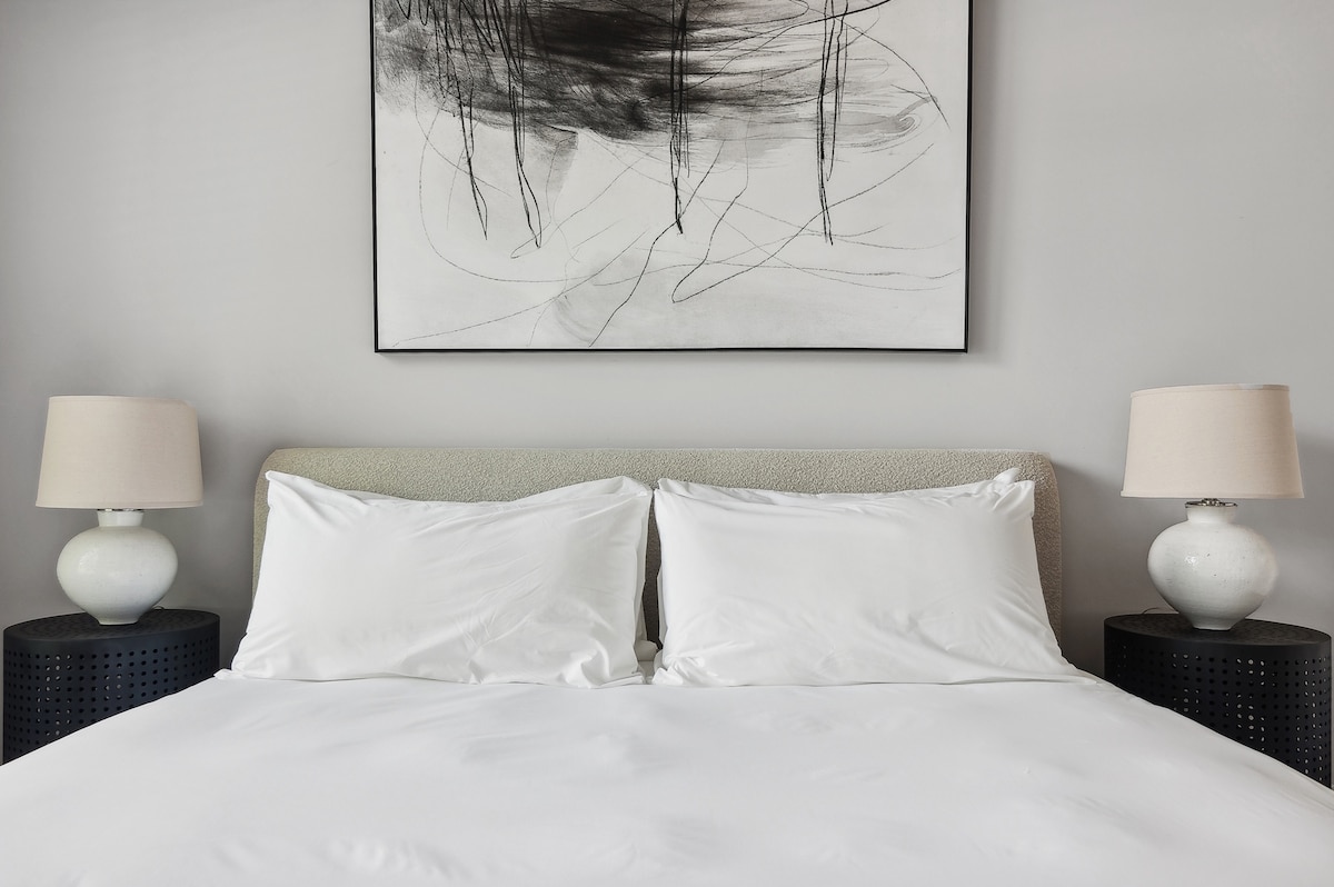 Come relax in this calm, stylish uptown bedroom. Well equipped kitchen, modern fully secured building and parking. We have a refreshing community pool and well-equipped gym. Smart TVs to sit back and relax. Great patio! Your comfort is our priority –As a bonus, enjoy complimentary wine and seamless self-check-in with our smart lock. Immerse yourself in style, convenience, and entertainment, making your stay an unforgettable experience