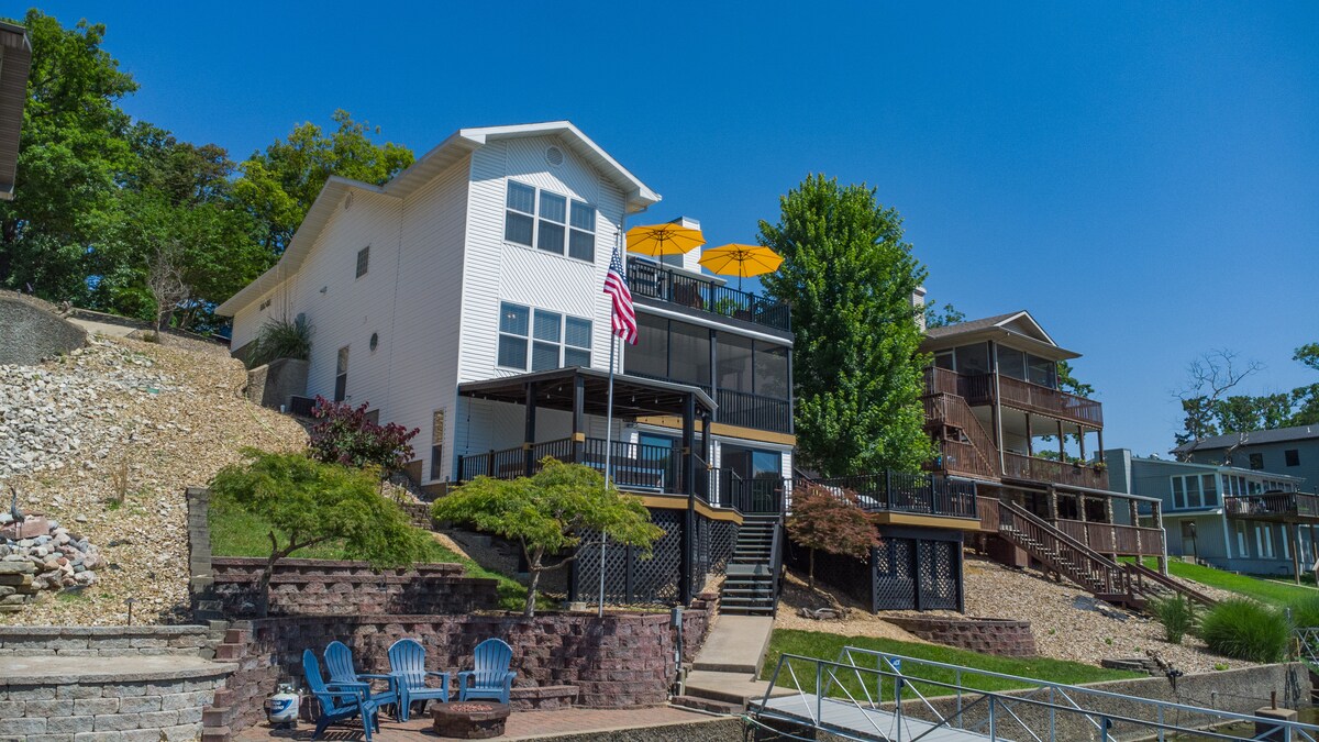 Entire lake house ready for your next lake retreat with family or friends. Spacious living area including outdoor deck space with a private dock and kayaks for use! Watch the sunset on the dock while grilling out or next to the gas fire pit. Cozy up next to the wood burning fireplace. **NEW LOWE Tritoon BOAT RENTAL option or space to side dock your boat. Close to the strip, grocery stores, and restaurants. Mini golf, go-karts, and a winery are also nearby. Perfect for a weekend or long get away.