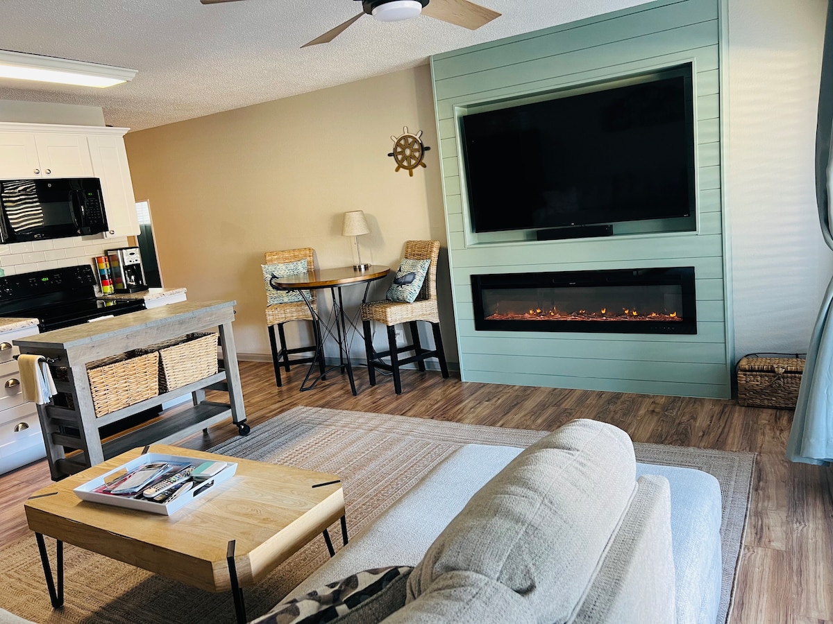 Lake life at its finest! Start your mornings with coffee on the waterfront deck as you watch wildlife and soak in serene views. This renovated, parking-level condo combines comfort and style with a plush queen bed and spacious walk-in shower. The modern kitchen boasts stainless appliances, oven/range, microwave, and personal electric grill. A Keurig with reusable pod for your own blend or the complimentary coffee pods add the perfect touch for a relaxing getaway.