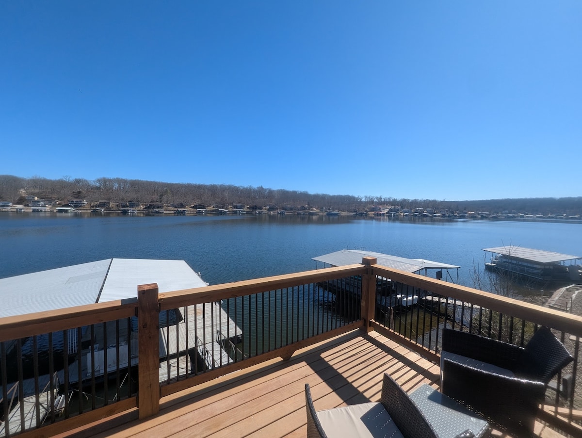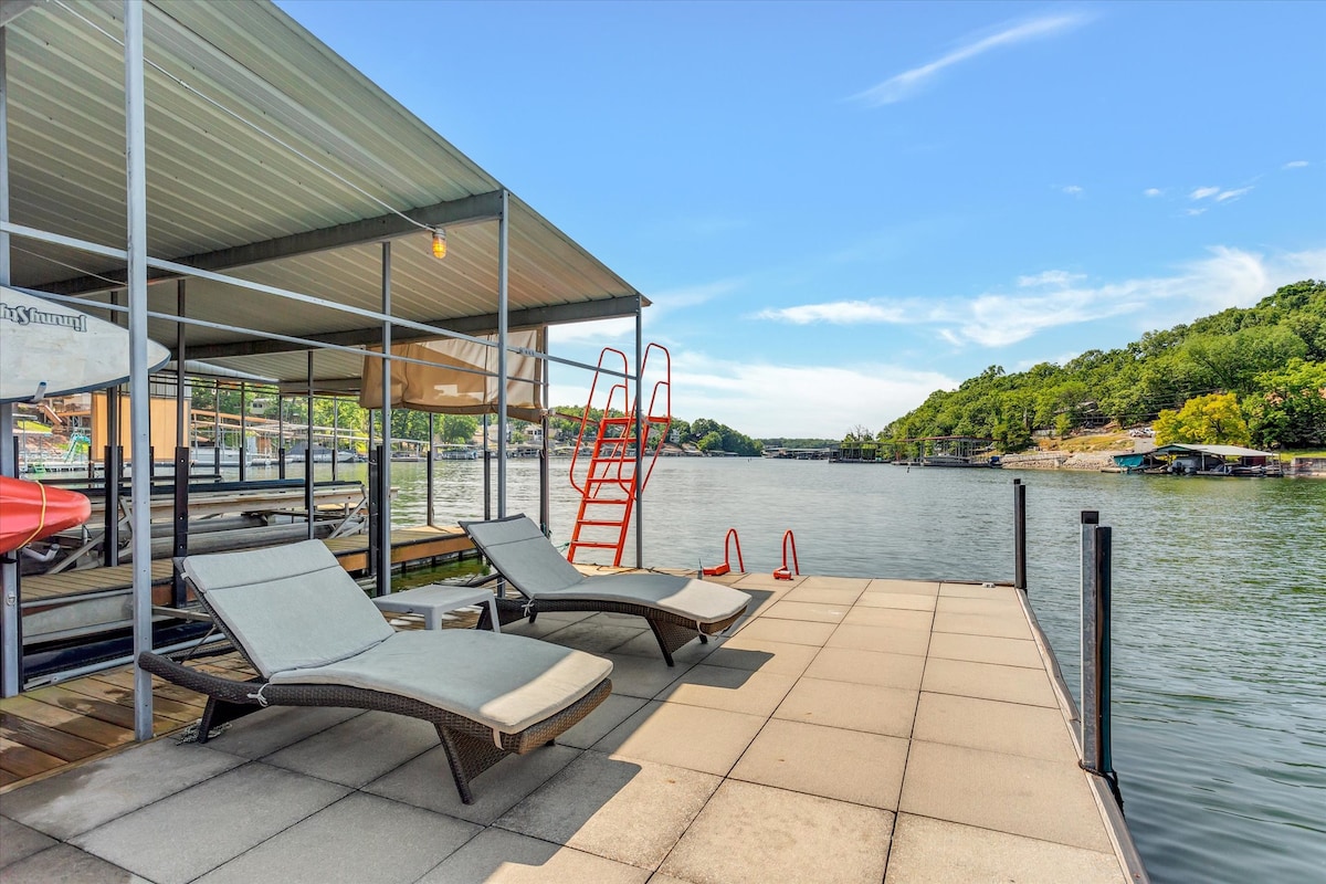 Entire lake house ready for your next lake retreat with family or friends. Spacious living area including outdoor deck space with a private dock and kayaks for use! Watch the sunset on the dock while grilling out or next to the gas fire pit. Cozy up next to the wood burning fireplace. **NEW LOWE Tritoon BOAT RENTAL option or space to side dock your boat. Close to the strip, grocery stores, and restaurants. Mini golf, go-karts, and a winery are also nearby. Perfect for a weekend or long get away.