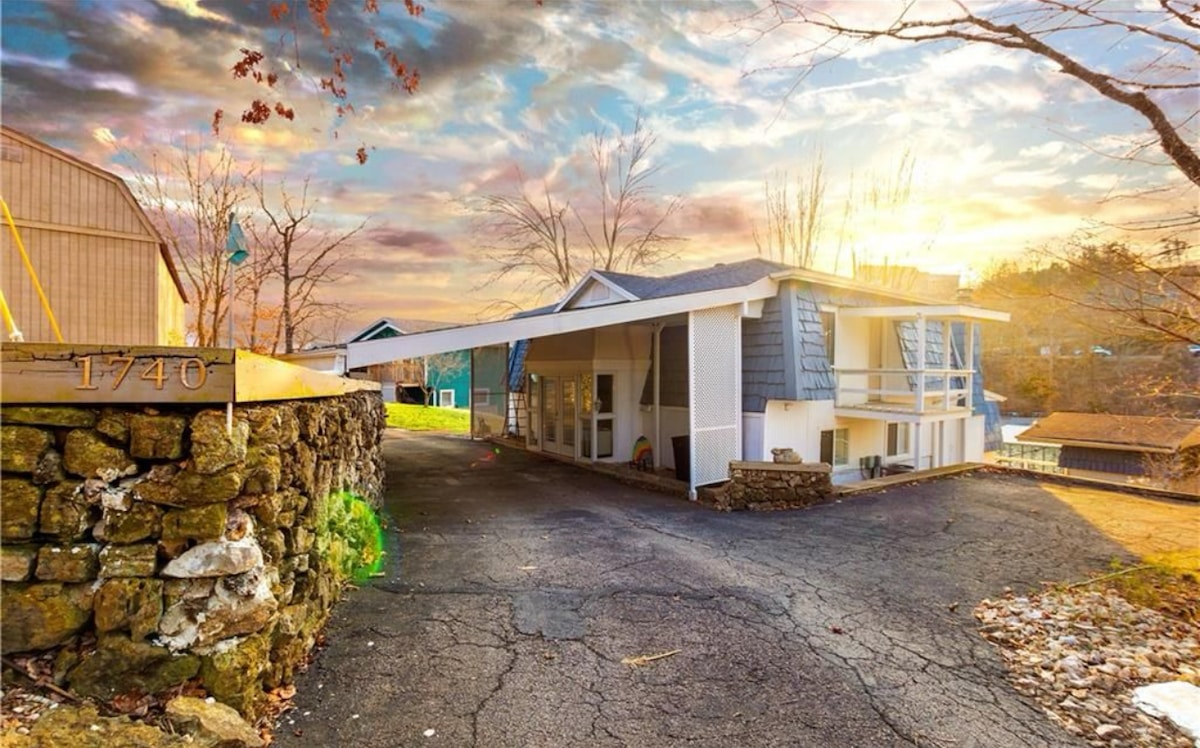 Entire lake house ready for your next lake retreat with family or friends. Spacious living area including outdoor deck space with a private dock and kayaks for use! Watch the sunset on the dock while grilling out or next to the gas fire pit. Cozy up next to the wood burning fireplace. **NEW LOWE Tritoon BOAT RENTAL option or space to side dock your boat. Close to the strip, grocery stores, and restaurants. Mini golf, go-karts, and a winery are also nearby. Perfect for a weekend or long get away.