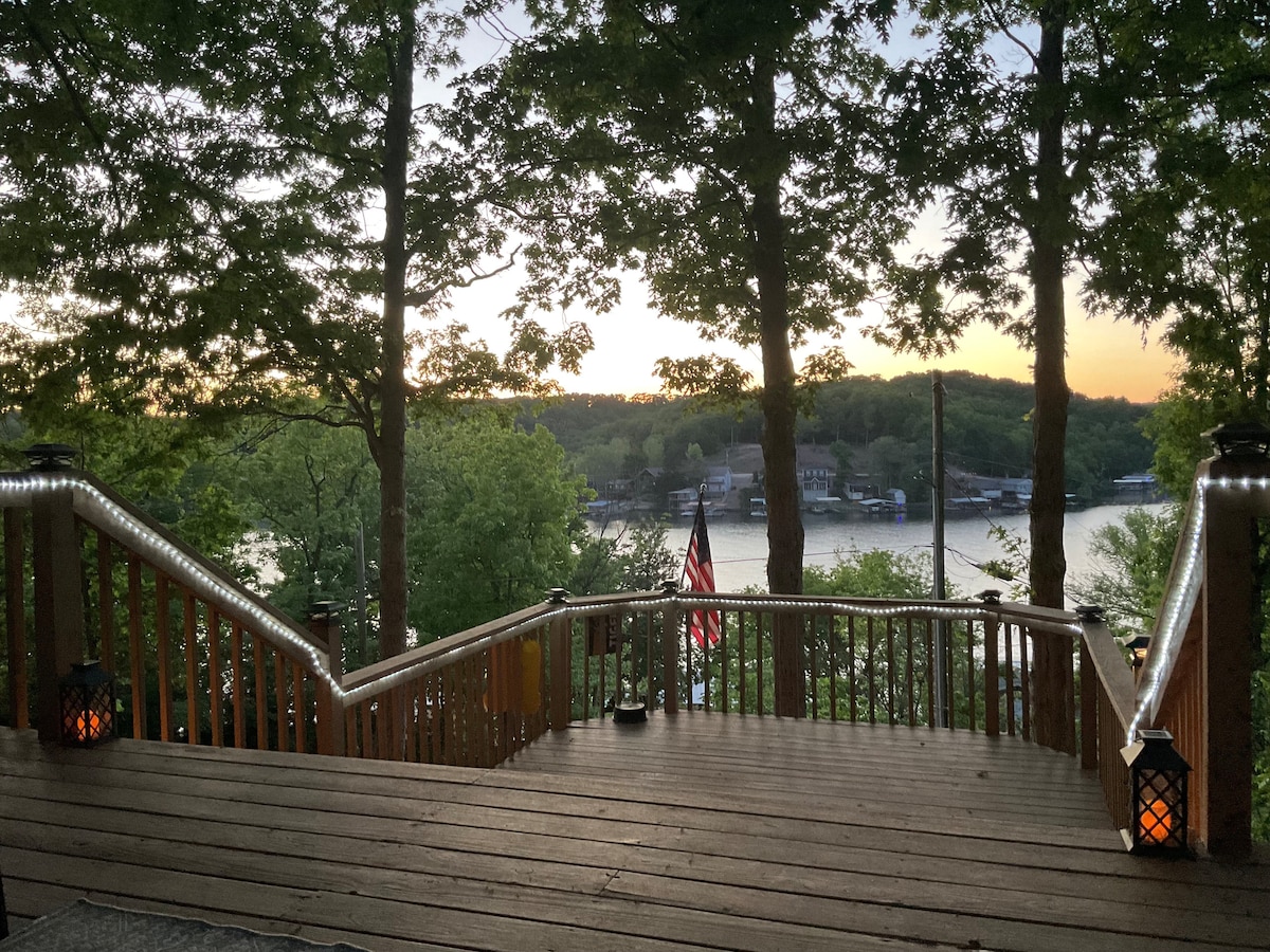 Rustic charm + Modern amenities. Our 1930's Cabin rests atop one of the most sought after view corridor at the lake. Over 100 feet above the water offering views of lake views for miles and gorgeous sunsets. Nestled away in the wilderness, peaceful days relaxing. Located in the heart of Osage Beach for ease of access to everything you need. Adjacent to Michael’s steak house and wine bar! *We are dog friendly; please see specifics under House Rules.Pet must be approved prior to booking.