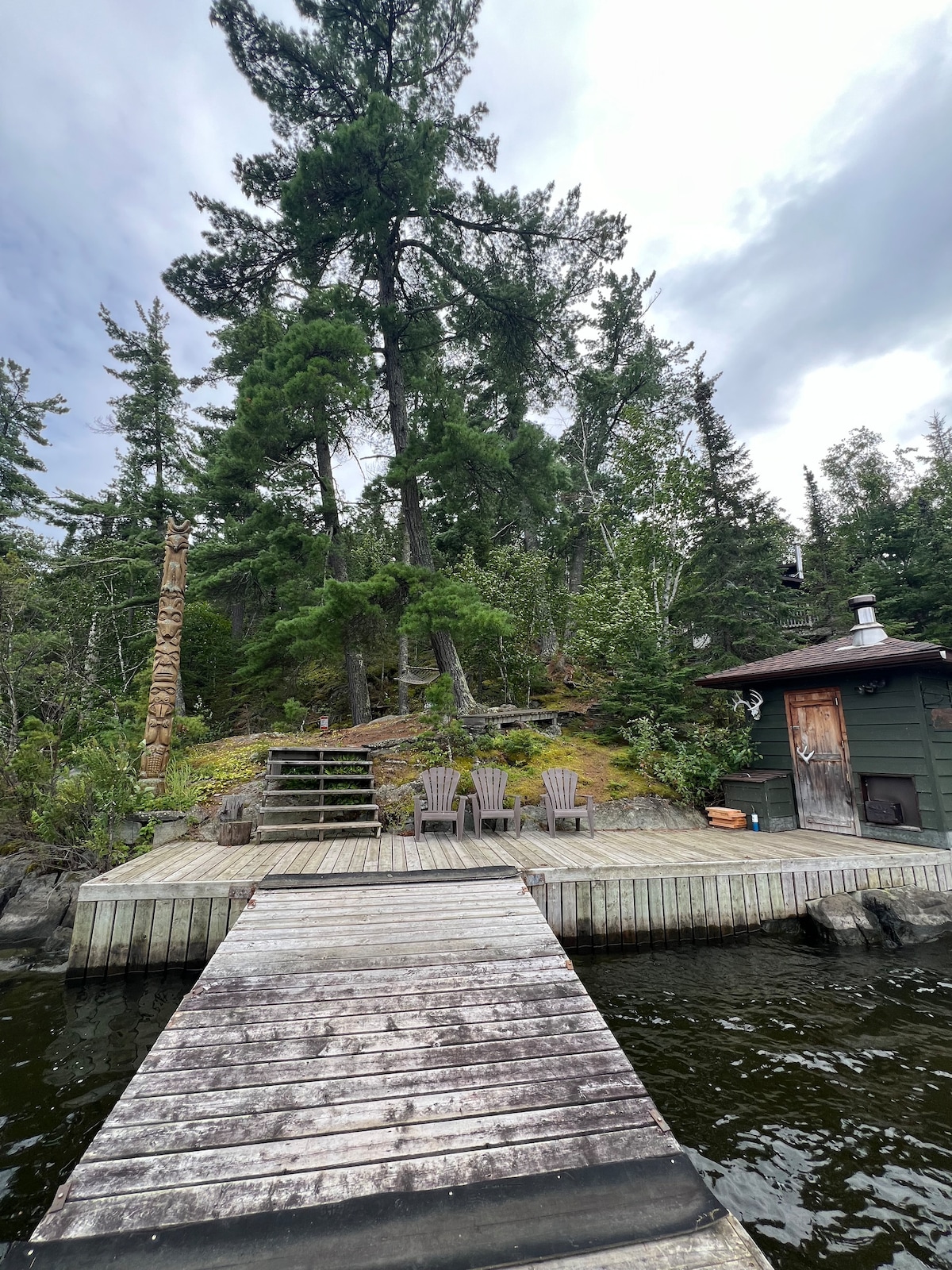 2 Bedrooms, 1 Bath. Downstairs bedroom has a single/double bunkbed. Upstairs bedroom is a loft with ladder to Queen bed. Lots of deck space, sauna, private dock, two screen rooms, fridge, propane oven, hydro electricity, wood stove for heat. Located in Quiet Bay, Shraggs Island on Lake of the Woods Ontario about 10 mins from town. Located in a beautiful calm quiet bay right on the water. 4 adults or family of 5 *Boat access only.* Boat taxis can be arranged through Green Adventures