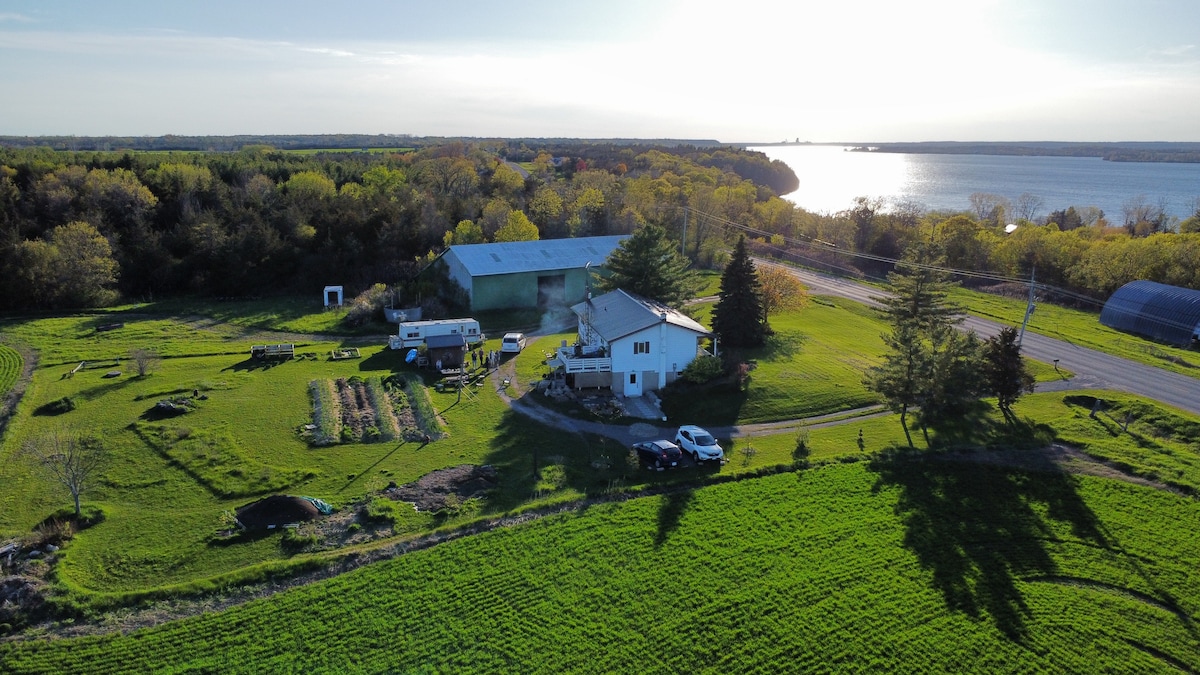This private cabin and deck has a stunning view of Adolphus Reach from the top of a 200' escarpment. The property is located right beside Lake on the Mountain Provincial Park. Have a look on Google Maps. Two eating establishments are within walking distance. Many more are less than 10km away. Day use at Sandbanks must now be reserved. Text me for details. I'm required to charge HST if you choose to book via Airbnb but not otherwise. Posted price includes HST. Licence ST-2019-0310