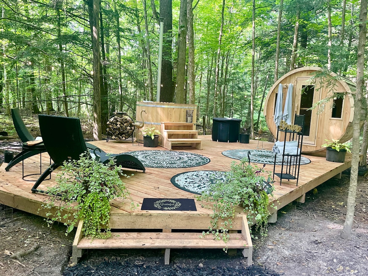 Get away and stay under the stars. In your private Glamping Tent. Enjoy a shared woodfired sauna and hot tub, followed by cold plunge. Only 45 minutes north of Toronto we offer a respite from the hustle and bustle. As the night falls, gather around a crackling, fire pit, swapping stories and laughter under the starry sky. When culinary inspiration strikes, a shared kitchen is at your disposal, providing all the necessary tools to craft a delightful meal to savour under the open sky.