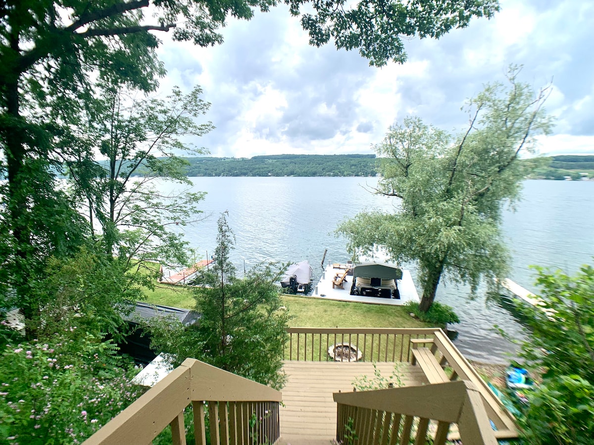 Lake, Wine, and Relax with the whole family. This 5 bedroom elevated A frame house includes 4 king beds, 2 twin beds, and also 2 queen sleeper sofas. The large kitchen and open eating area can accommodate a small or large group. The private dock with direct access to the lake provides fun for everyone. This home is perfect for a weekend or week long getaway with family and friends. Ten minutes from Seneca Falls, nestled along the Cayuga Wine Trail with private and peaceful lakefront views.