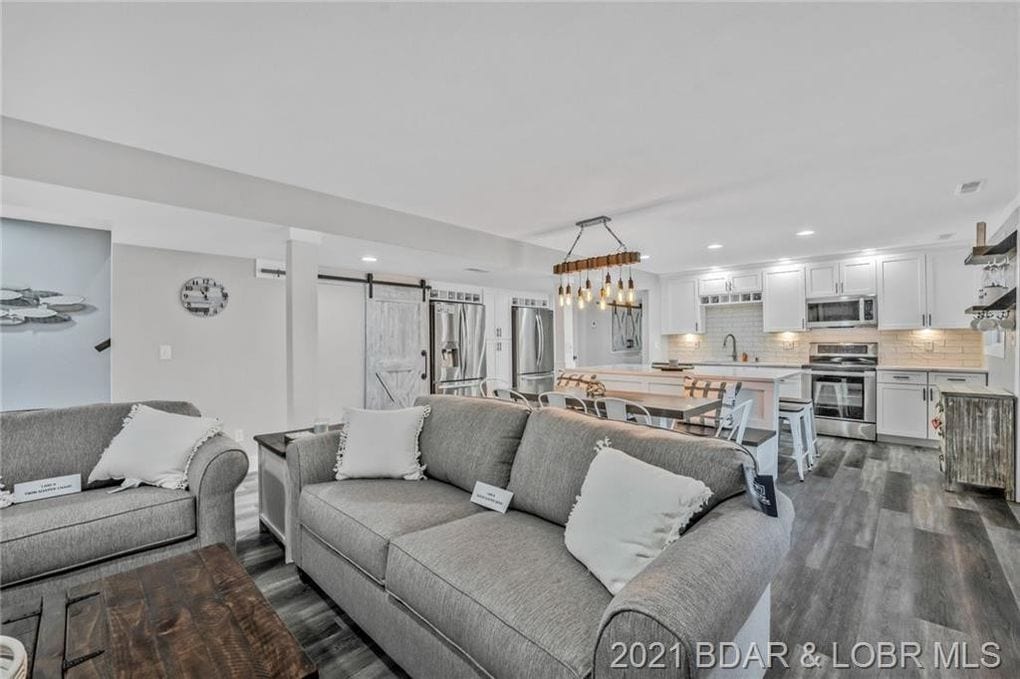 Enjoy a prime Osage Beach location with restaurants and a grocery store within walking distance, plus quick access to waterfront favorites like Dog Days and Backwater Jacks. The outdoor space features lake views, a private patio with pergola, dining table for six, custom cornhole boards, charcoal grill, and a bonfire area with firewood included. Over 140 outdoor lights create a warm evening atmosphere, and 50 ft of private parking easily fits a truck, trailer, boat, or up to three vehicles.