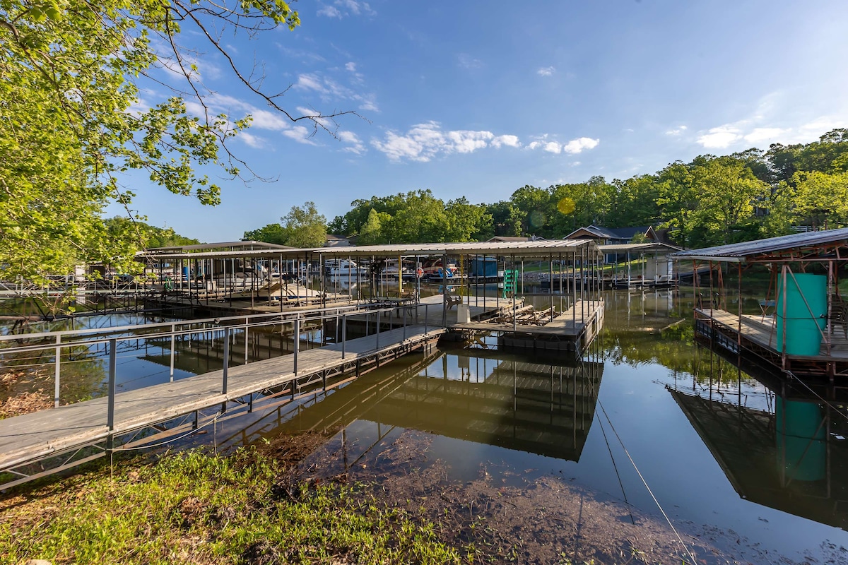 Entire lake house ready for your next lake retreat with family or friends. Spacious living area including outdoor deck space with a private dock and kayaks for use! Watch the sunset on the dock while grilling out or next to the gas fire pit. Cozy up next to the wood burning fireplace. **NEW LOWE Tritoon BOAT RENTAL option or space to side dock your boat. Close to the strip, grocery stores, and restaurants. Mini golf, go-karts, and a winery are also nearby. Perfect for a weekend or long get away.