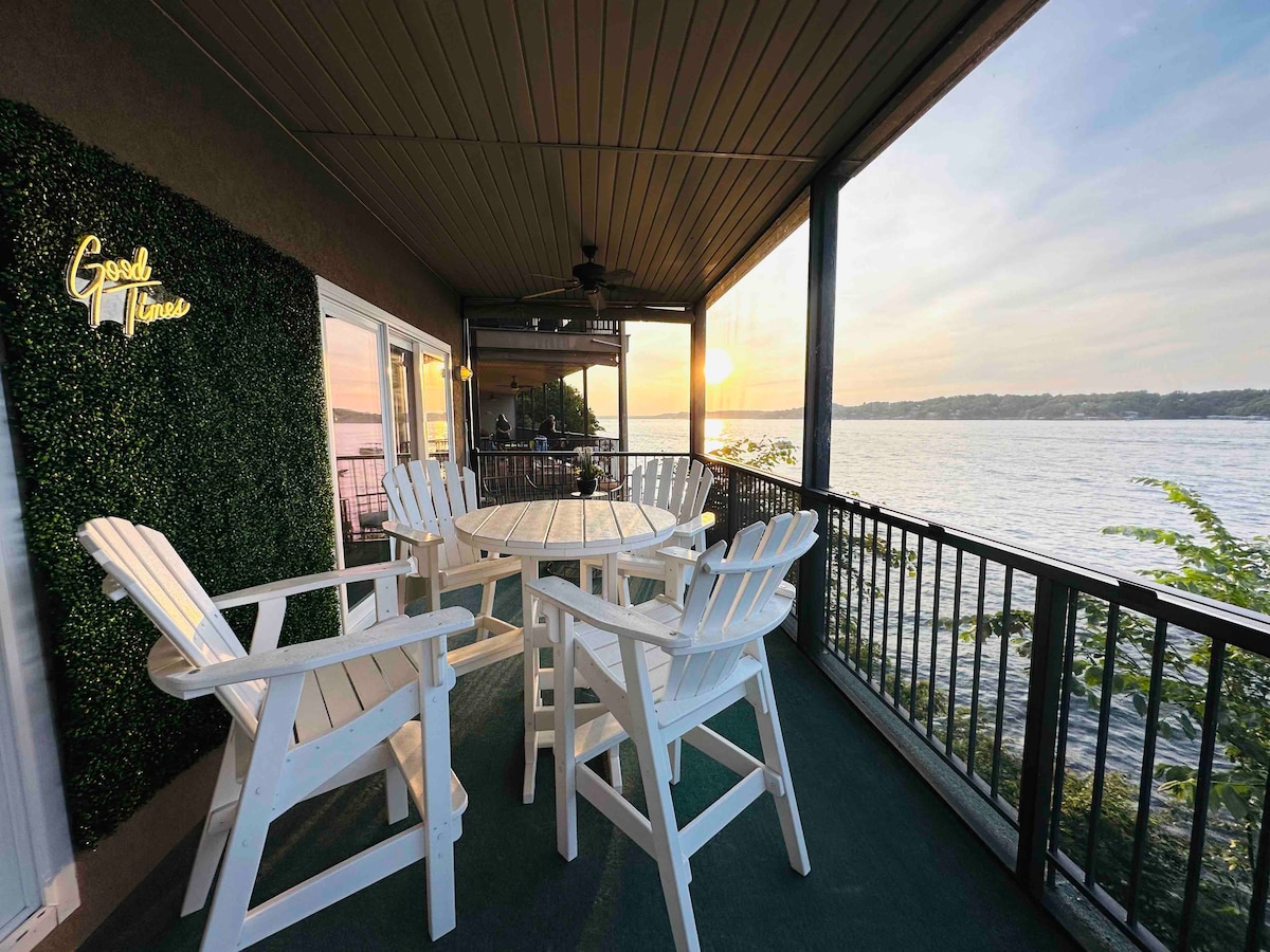 Entire lake house ready for your next lake retreat with family or friends. Spacious living area including outdoor deck space with a private dock and kayaks for use! Watch the sunset on the dock while grilling out or next to the gas fire pit. Cozy up next to the wood burning fireplace. **NEW LOWE Tritoon BOAT RENTAL option or space to side dock your boat. Close to the strip, grocery stores, and restaurants. Mini golf, go-karts, and a winery are also nearby. Perfect for a weekend or long get away.