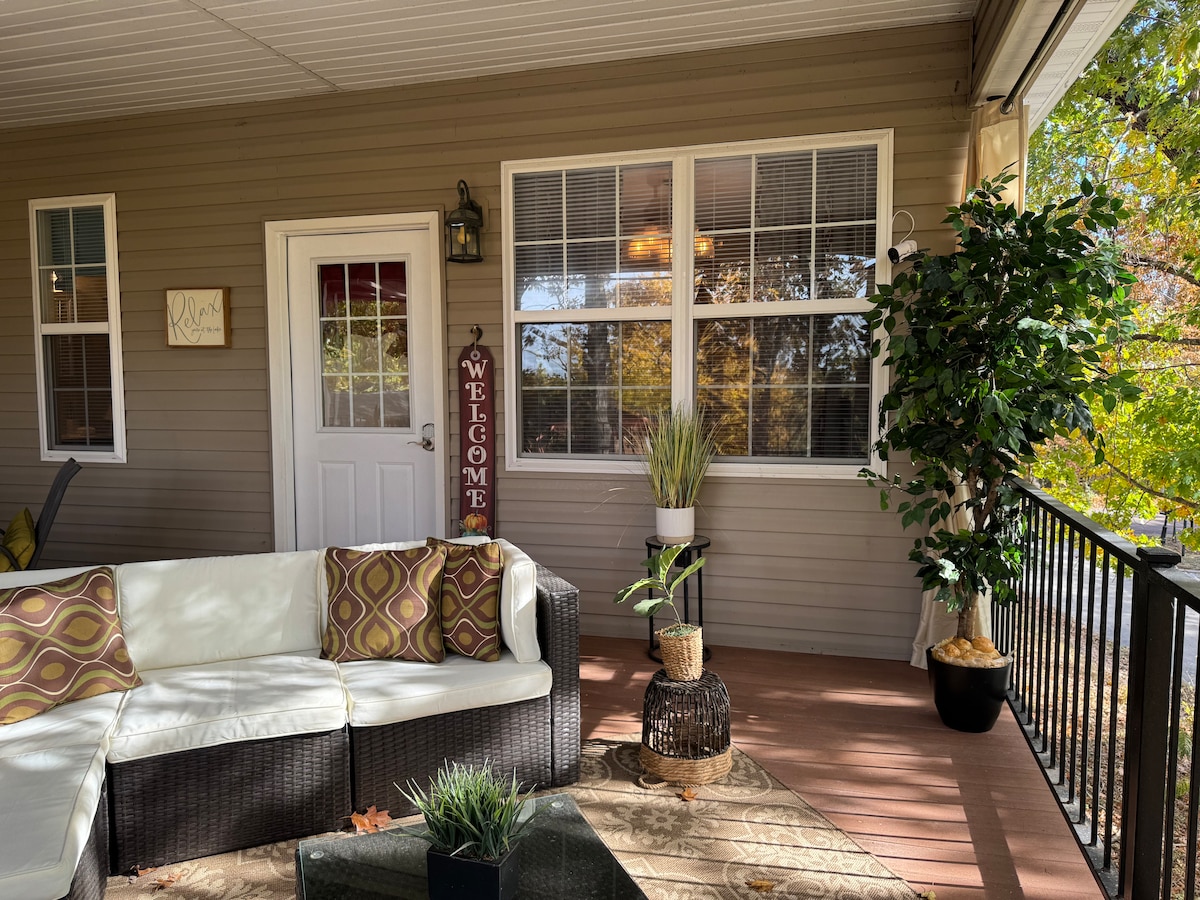 Entire lake house ready for your next lake retreat with family or friends. Spacious living area including outdoor deck space with a private dock and kayaks for use! Watch the sunset on the dock while grilling out or next to the gas fire pit. Cozy up next to the wood burning fireplace. **NEW LOWE Tritoon BOAT RENTAL option or space to side dock your boat. Close to the strip, grocery stores, and restaurants. Mini golf, go-karts, and a winery are also nearby. Perfect for a weekend or long get away.