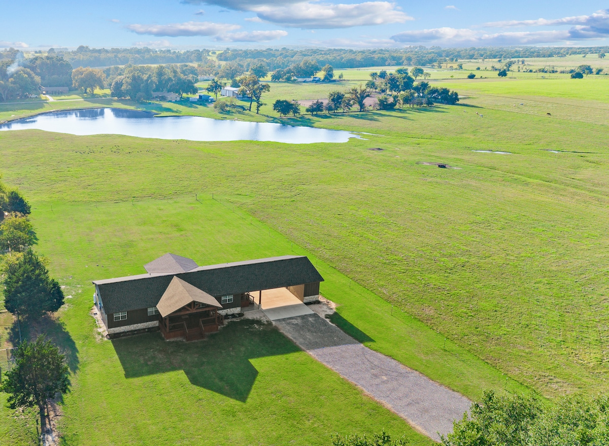 Just minutes from LAKE ATHENS - rare opportunity to experience actual RANCH living on this 30 acre miniature horse ranch. Beautifully appointed new 2 bedroom 2 bath ranch house with front porch overlooking the coastal pasture. Spend time exploring 30 acres of woods, the spring fed tank or just marvel at the animals galore. We have 5 large horses, over 100 miniature horses, numerous miniature goats and their adorable babies and don't miss our pot belly pigs. Fun for the whole family.