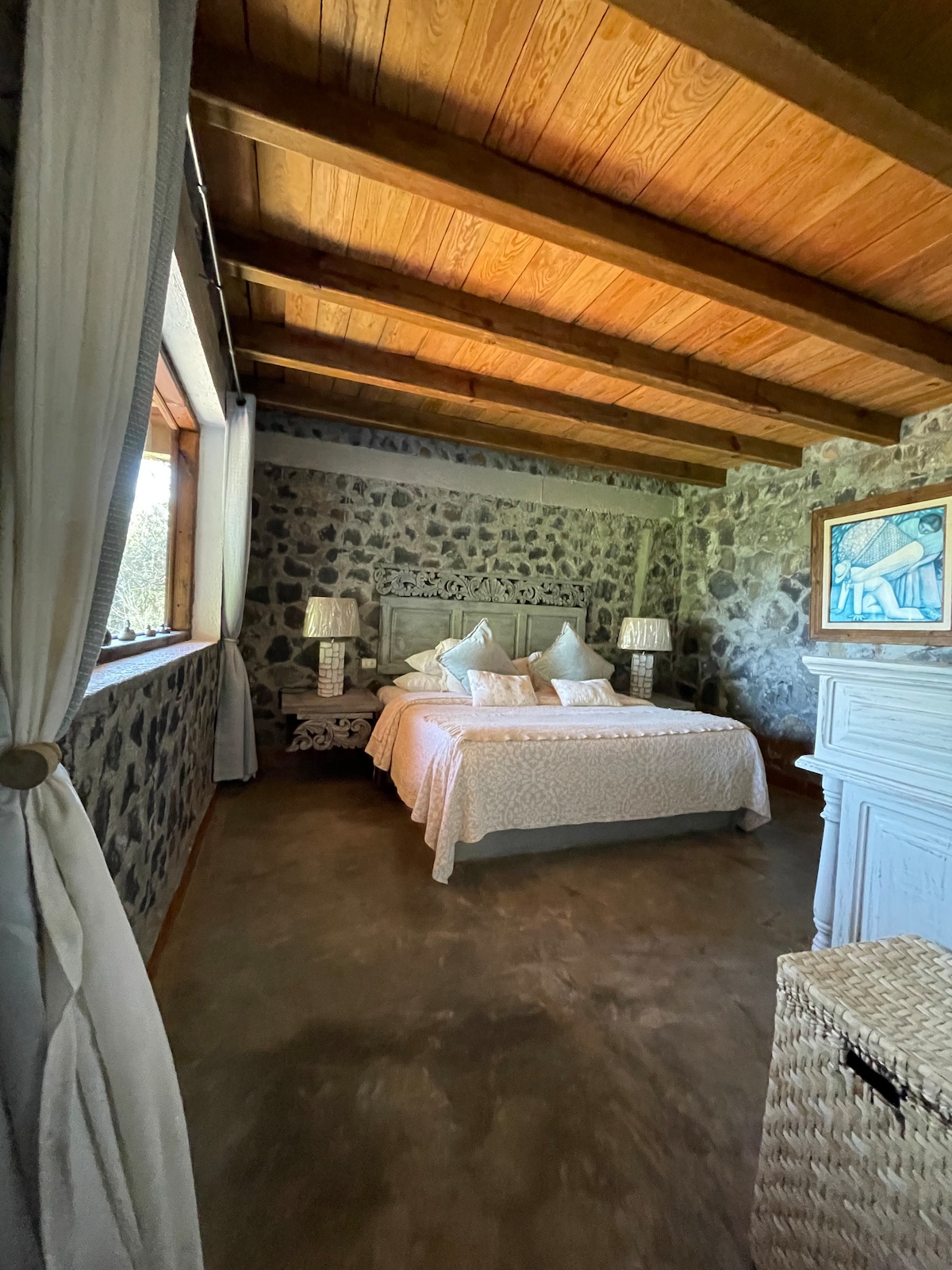 Una cabaña tipo alpina elevada sobre una plataforma de madera, entre campos de espárrago y maíz abiertos y agua, rodeada de las últimas tierras antes de la montaña. Sin vecinos cercanos, sólo naturaleza viva, ganado bravo a lo lejos, y el canto de las aves y los coyotes. Por las noches, el cielo es puro espectáculo. Estrellas, luna y a veces luciérnagas. Las charlas junto al fuego saben distinto cuando no hay otra luz que las del fuego y las del firmamento. Un espacio para detener el ritmo