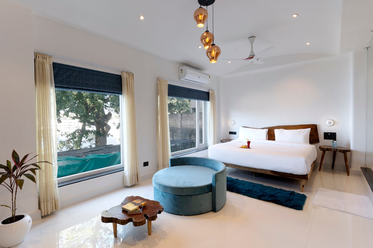 ★ Breakfast, 1 Luxury Balcony Room ( 1st Floor) ★ Private Premium Bathroom ★ MiniBar ★ Architectural Heritage & Modern amenities ★ Shared Pool ➤ We Host Foreign & Indian guests throughout the year. ➤ Peaceful Location: ★ 15mins to Udaipur City Palace ( 5.5 Km), Lakes & markets! ★ Taxi Service ★ Personalized Itinerary for exploring hidden gems/culture ★ Local Cuisine option ➤ Adorned with beautifully designed Rooms overlooking the Indoor Pool, the Majestic Monsoon Palace/ Aravalli Hills!