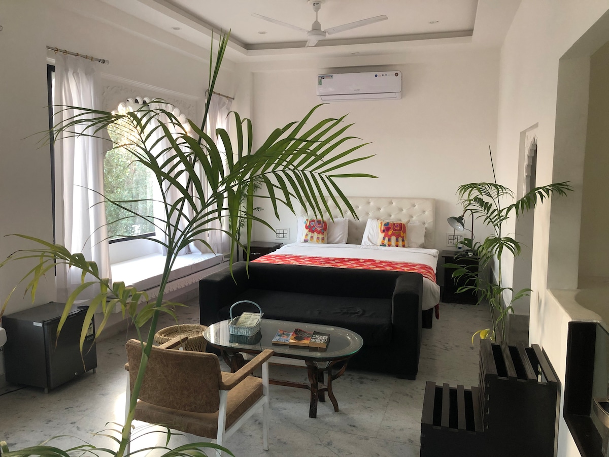 ★ Breakfast, 1 Luxury Balcony Room ( 1st Floor) ★ Private Premium Bathroom ★ MiniBar ★ Architectural Heritage & Modern amenities ★ Shared Pool ➤ We Host Foreign & Indian guests throughout the year. ➤ Peaceful Location: ★ 15mins to Udaipur City Palace ( 5.5 Km), Lakes & markets! ★ Taxi Service ★ Personalized Itinerary for exploring hidden gems/culture ★ Local Cuisine option ➤ Adorned with beautifully designed Rooms overlooking the Indoor Pool, the Majestic Monsoon Palace/ Aravalli Hills!