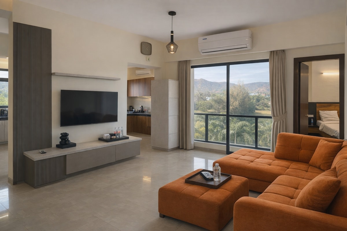 Bring the whole friends & family to this great place with lots of room for fun. - All large rooms equipped with 55” inch TV. - Spacious, clean, and beautifully furnished interiors - One Room with private Swimming Pool of 225 sqft - Fast Wi-Fi & Smart TV - Fully equipped kitchen with essentials - 24/7 hot water & air conditioning - Private balcony - Easy and secure parking - Bathroom essentials- Biotique Perfect for Couples & families looking for a stylish, peaceful, and well-connected stay.