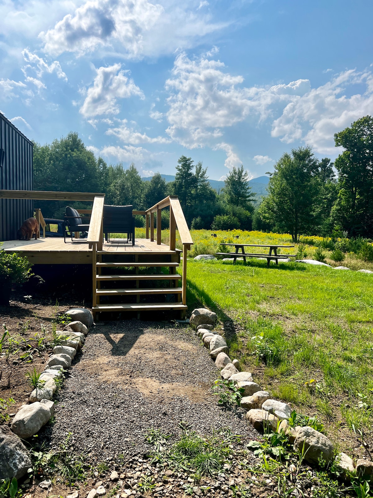 Stay in a quiet modern cabin centrally located on a country road in Keene, Home of the High Peaks in the Adirondacks. Only 15/20min drive to all main attractions: Lake Placid, Whiteface, Adirondack Loj and Marcy Dam. A bright and peaceful oasis to unwind from your ADK adventures with a view of the mountains from your bed, the deck, or fire pit. Enjoy a private meadow with access to a natural brook with swimming holes and waterfalls. Queen bed + pullout couch that can sleep 1 adult/2 kids. RELAX!